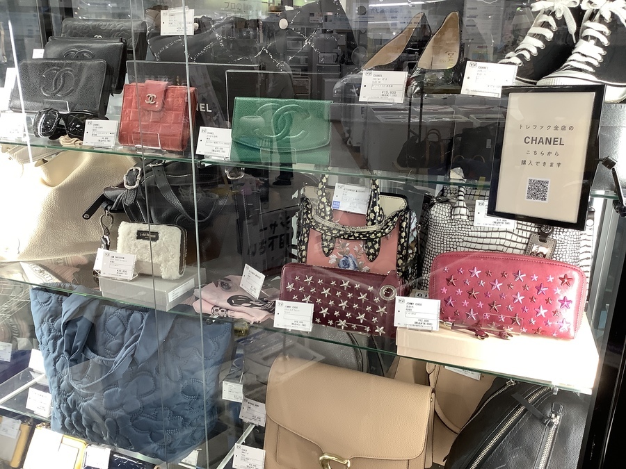 店舗入口のショーケースにはプラダ、グッチ、フェンディ、シャネルのバッグや財布を多数展示しています。