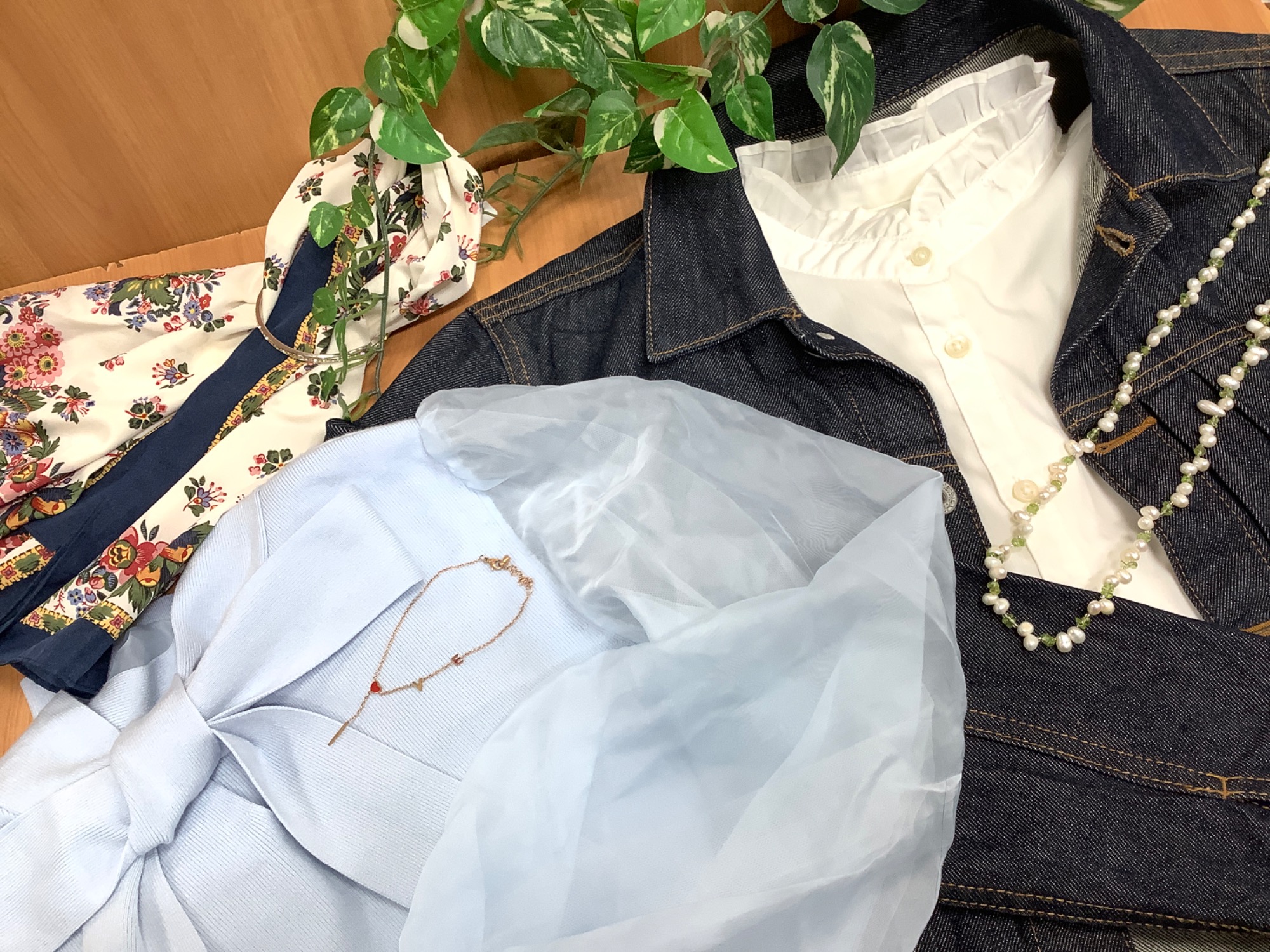デニムジャケット / フェイクレザージャケット / 薄手カーディガン / シアーブラウス / クルーネックスウェット / フリルトップス/ ティアードスカート / バレルレッグパンツ / カーブパンツ / スカーフ 等