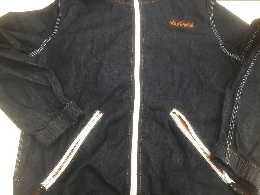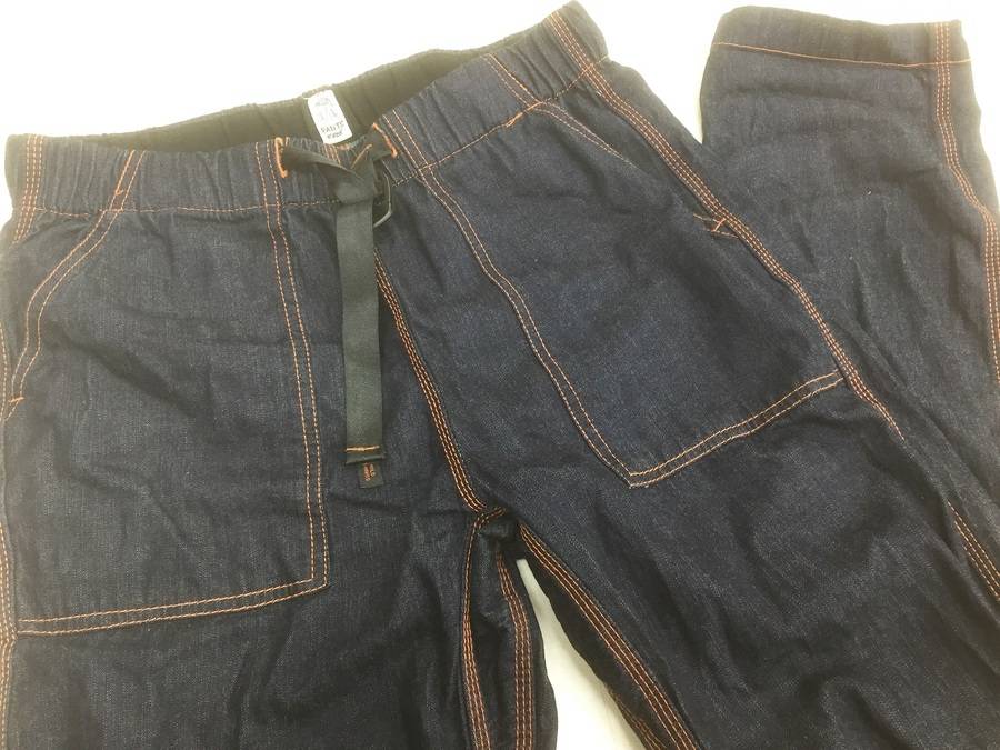 パンツも同色、ネイビーにオレンジのステッチが目立ちます。