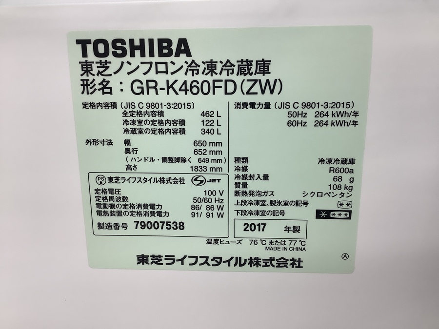 【大容量冷蔵庫はいかがですか!!】TOSHIBA 6ドア冷蔵庫GR-K460FD入荷しました!