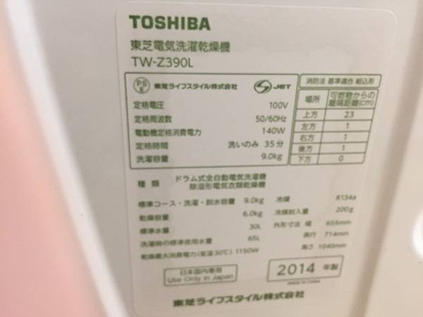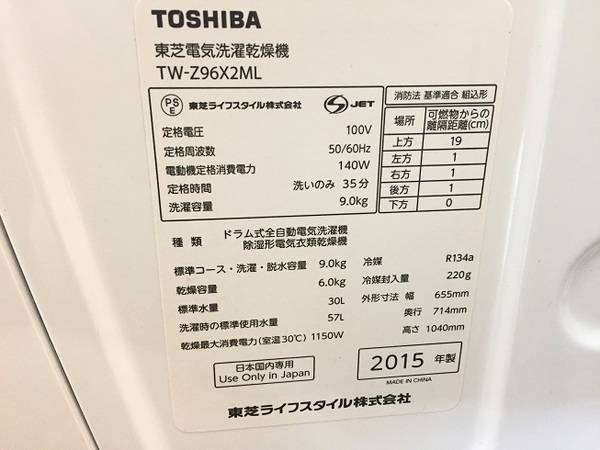 洗濯容量9kg、乾燥容量6kgの東芝の洗濯機です。