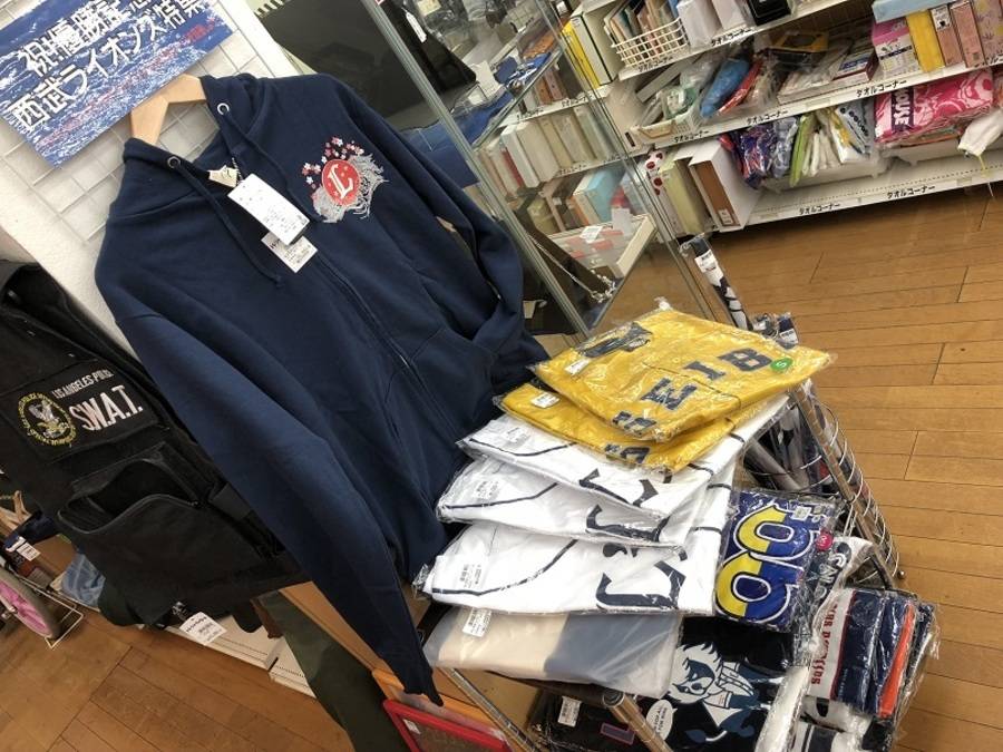 応援ユニフォームやライオンズのTシャツ、応援フラッグ、タオルなど