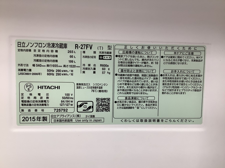 HITACHI(ヒタチ)3ドア冷蔵庫 2015年製入荷致しました!【川崎野川店】