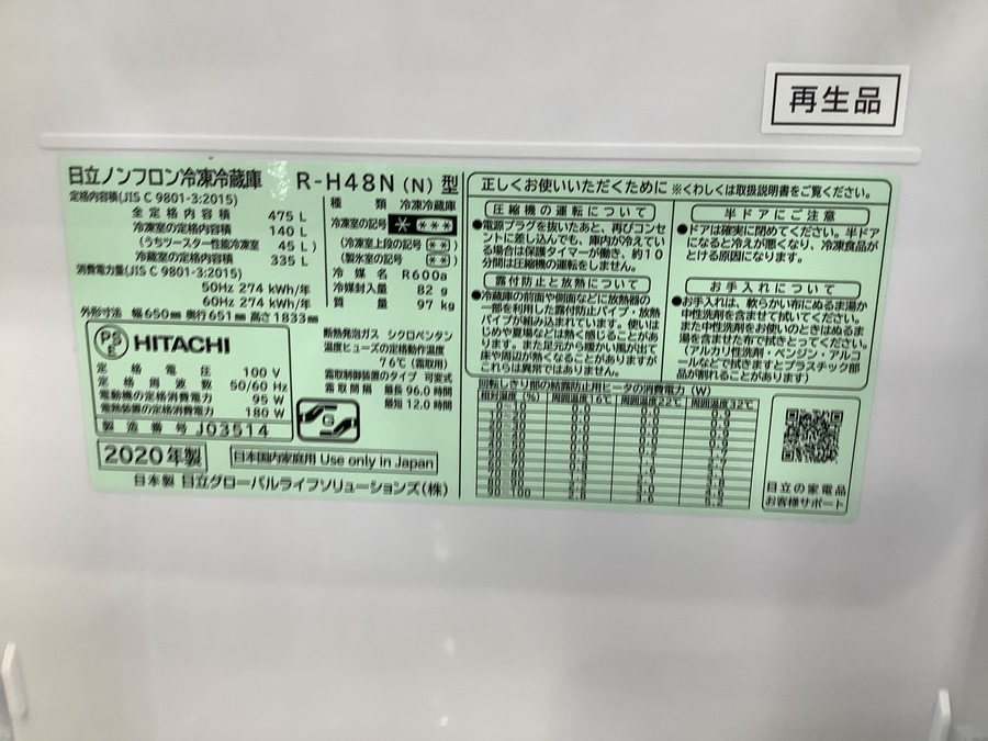 【2020年製】HITACHIの6ドア冷蔵庫 R-H48N が入荷致しました!!