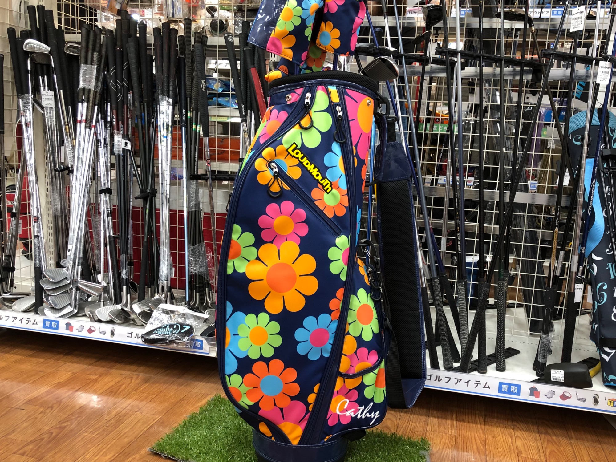 ゴルフバッグや柄にデザインされた花柄が