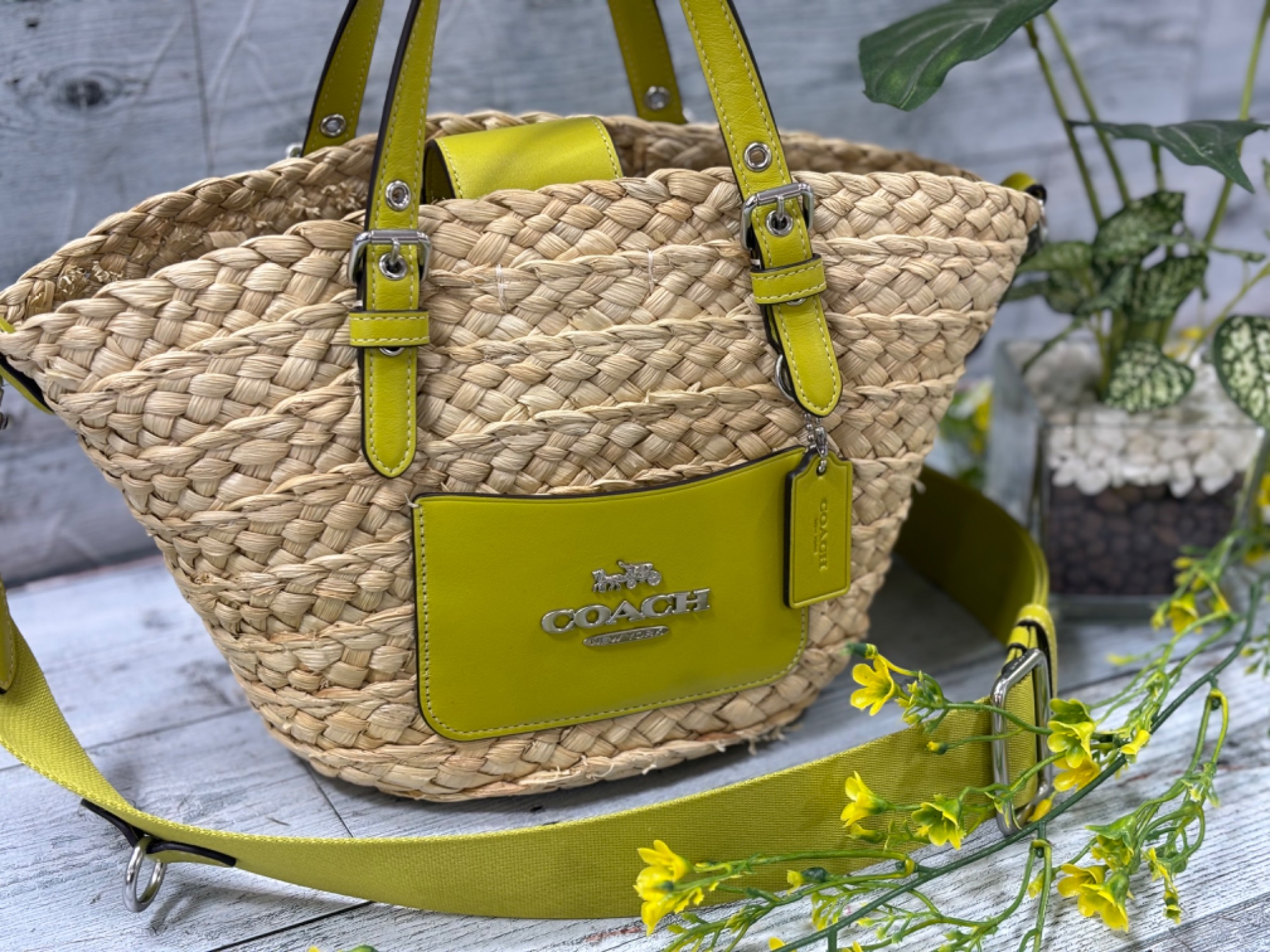 春から夏にかけてこれからの季節にピッタリなカゴバッグで、春らしい黄緑色に夏らしいストロー材のさわやかさがとても魅力的な一品になります!!