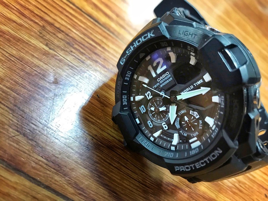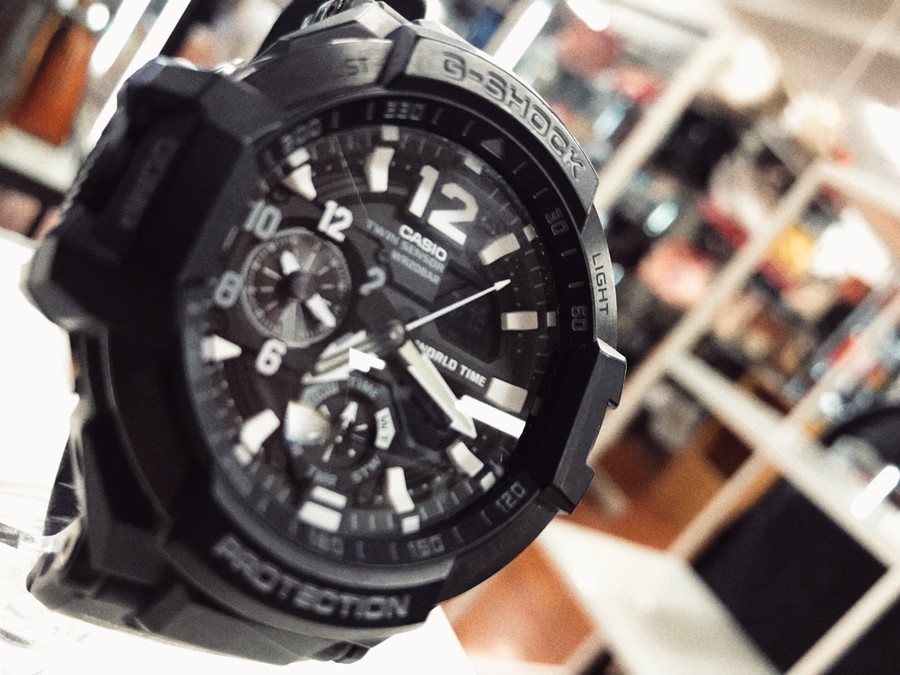 こちらのスカイコックピットはタフネスさを売りにしており、パイロットに必要なワールドタイム機能に加え、日/曜/月の情報が表示される多機能リストウォッチとなっております。