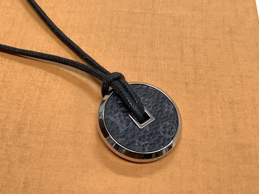 モノグラム柄がプリントされたコインモチーフのネックレスとなっております。