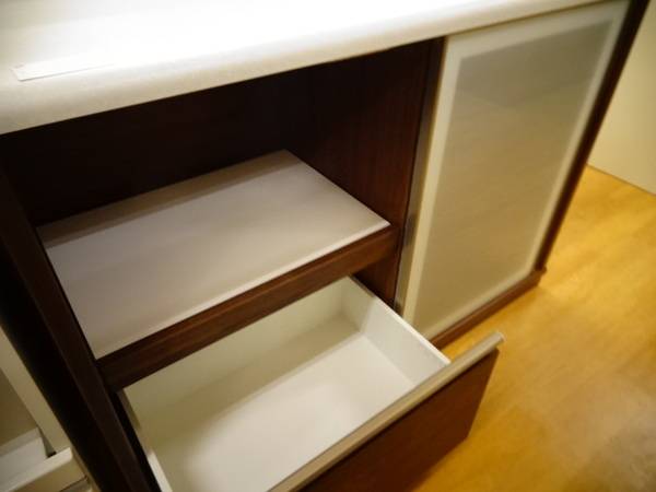 スライド式の扉を採用し、食材、食器どちらも保管できるのが強み。