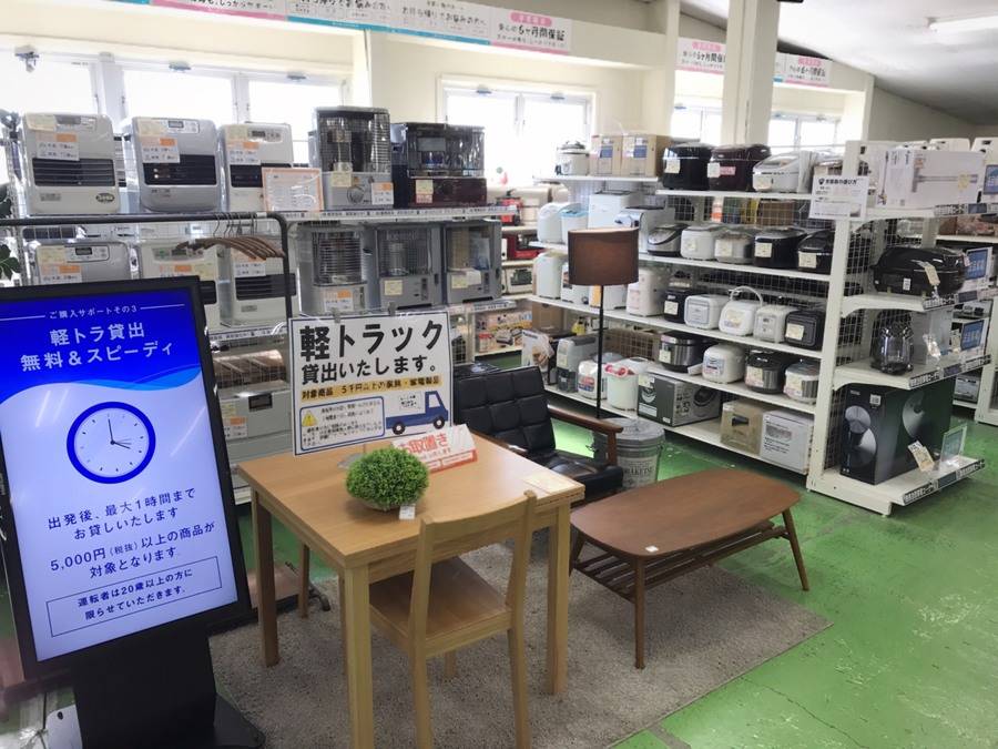 お買い上げいただいた家具をご自宅まで持ち帰るのに軽トラック貸し出しサービス、有料での配送サービスをご用意しております。自家用車でお持ち帰りの際はお車までお手伝いいたします。