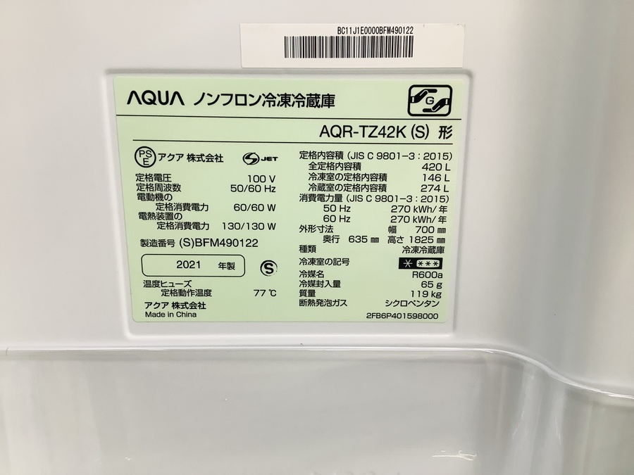 商品名:4ドア冷蔵庫AQR-TZ42K