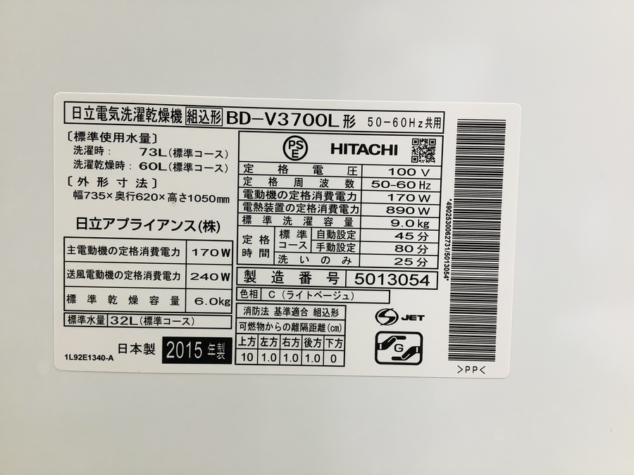 HITACHI(ヒタチ)のドラム式洗濯乾燥機BD-V3700L入荷致しました!