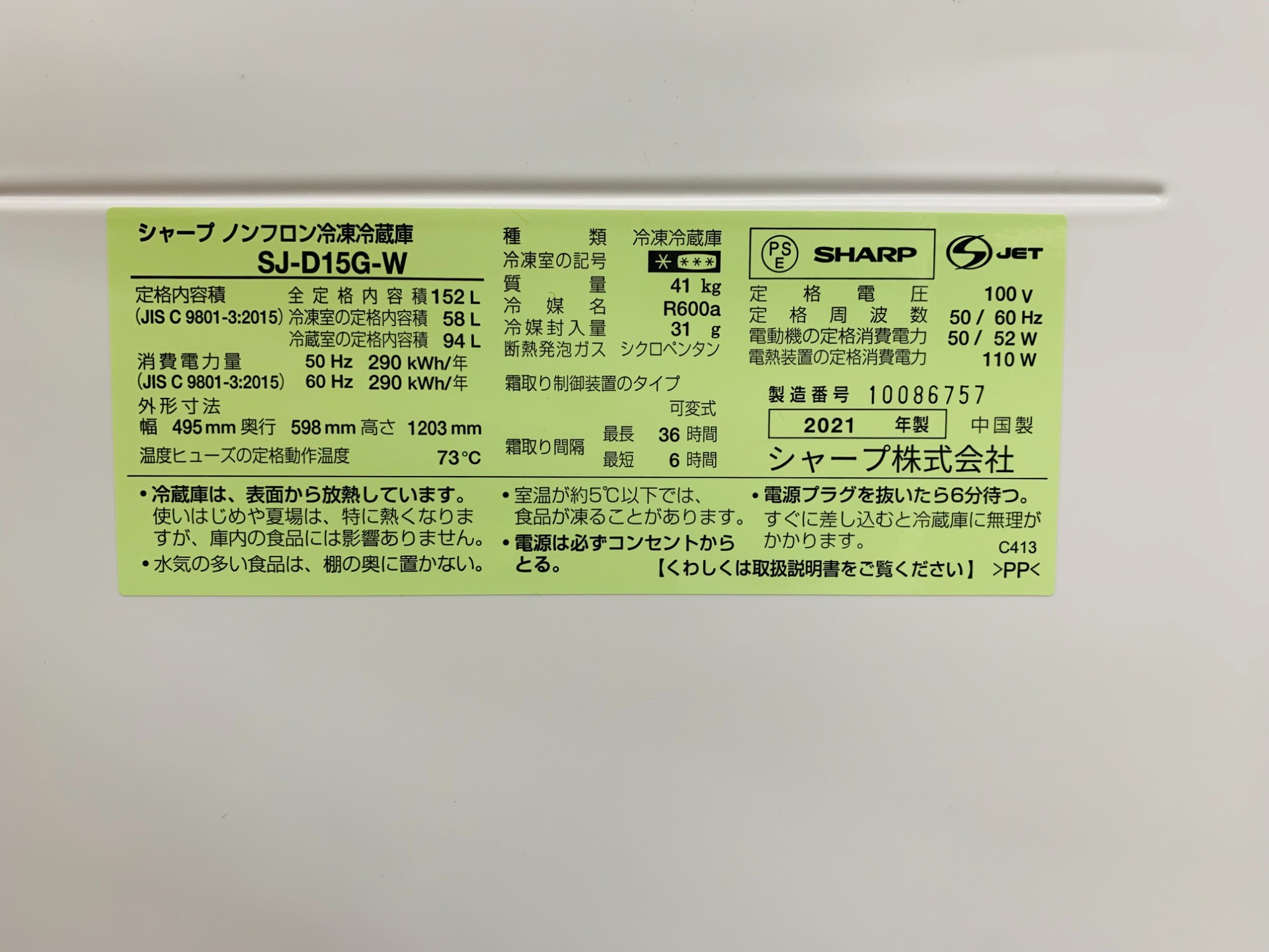 商品名:2ドア冷蔵庫SJ-D15G-W