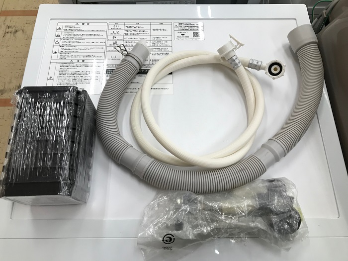 付属品は給水ホース、排水ホース、高さ調整の脚