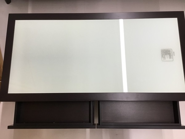 2つの大きな収納棚を内蔵したガラステーブルになります!!