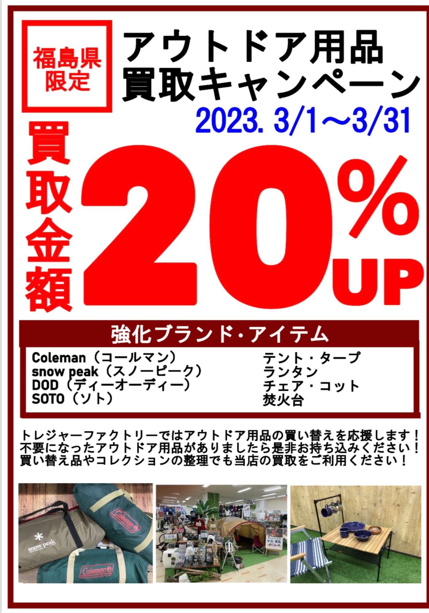 福島県限定!アウトドア買取20%U Pキャンペーン開催中です!