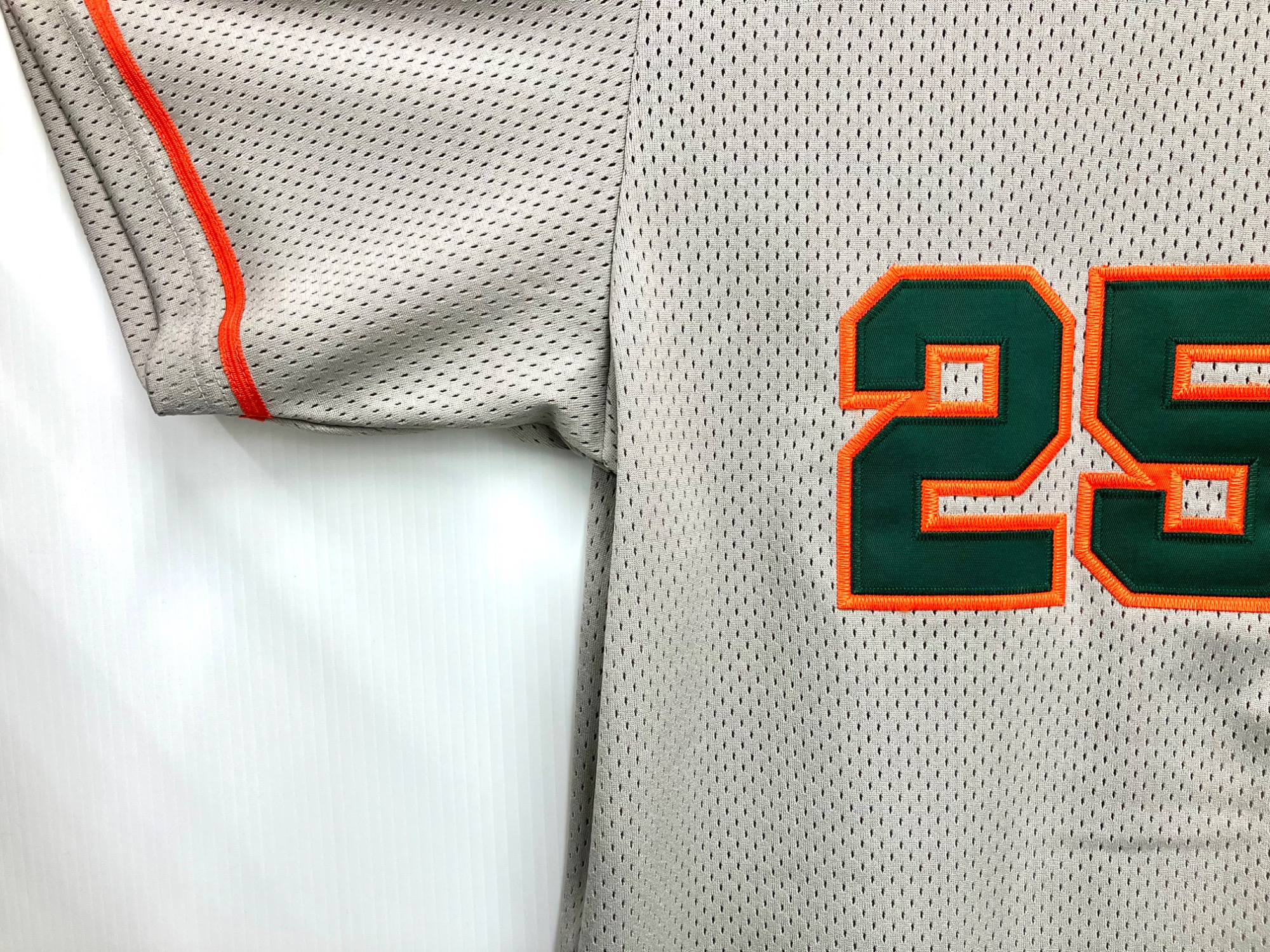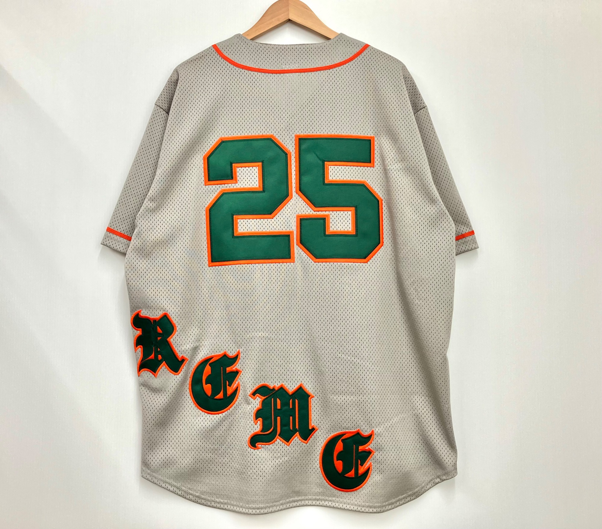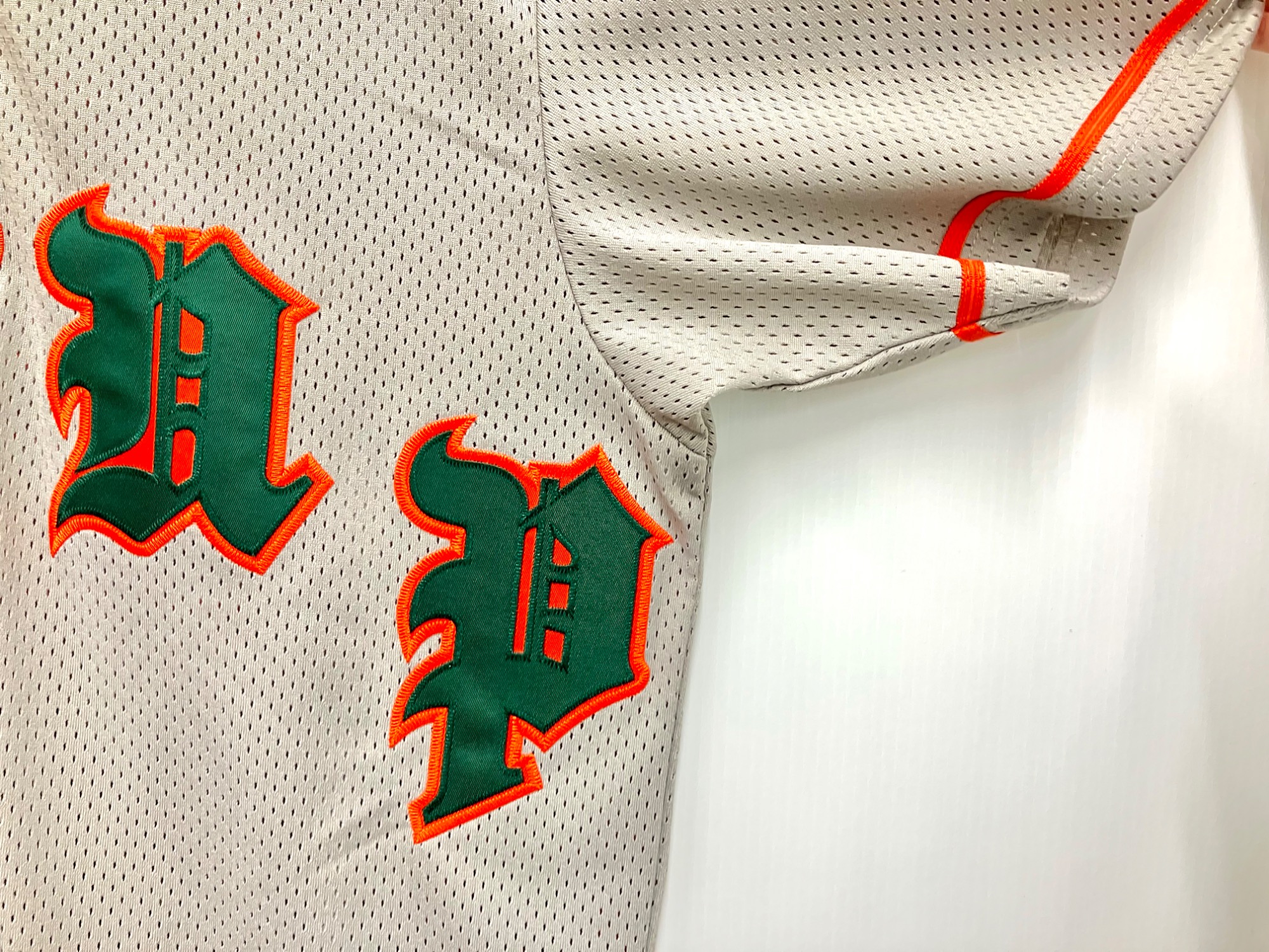 斜めに刺繍されたロゴデザインと、オレンジとグリーンのアクセントカラーが目を惹くベースボールシャツです