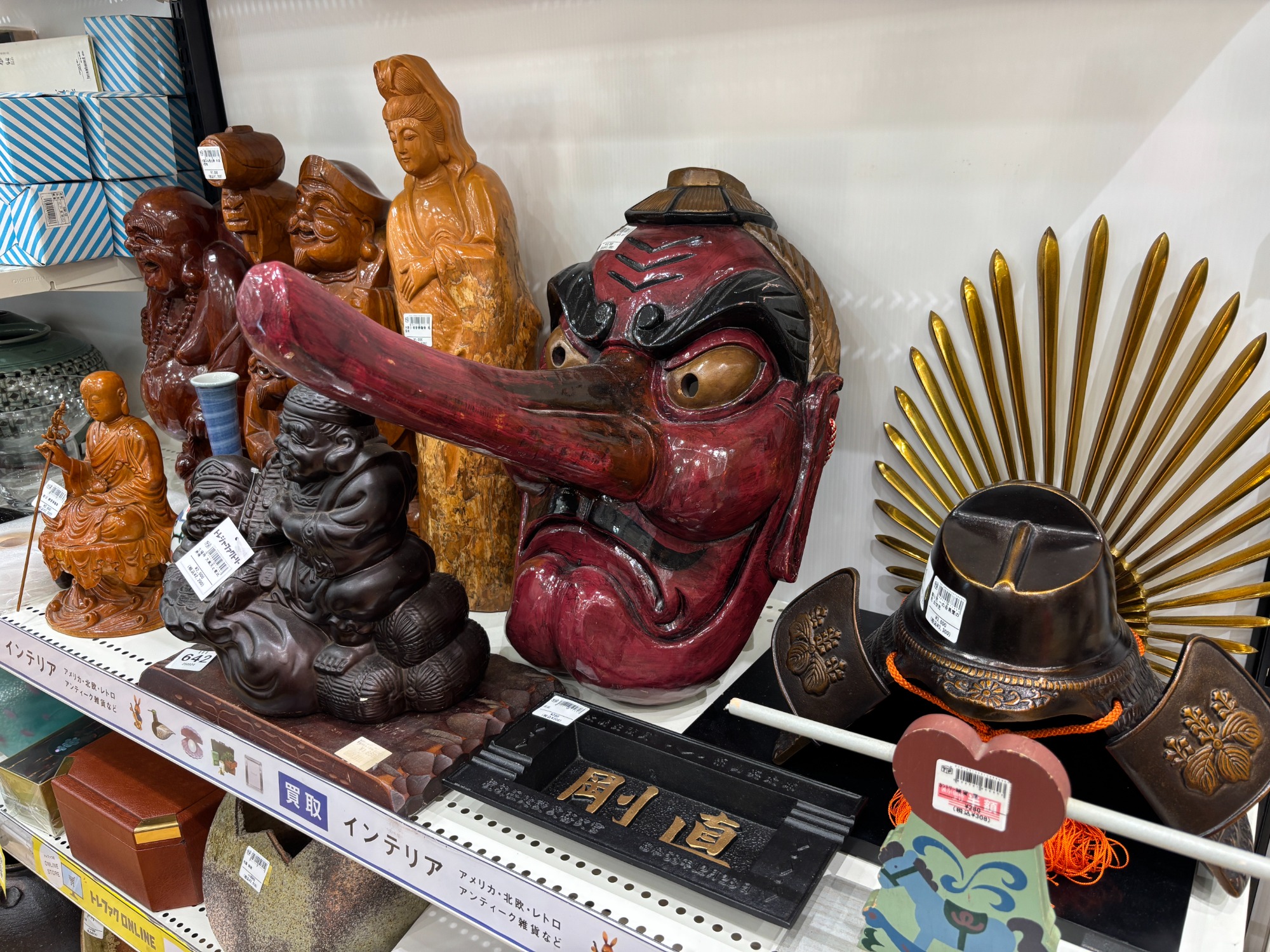 天狗のお面や七福神の置物など旅行のお土産でもらった雑貨品