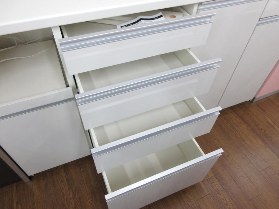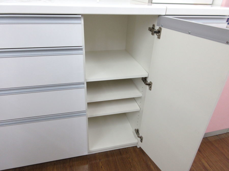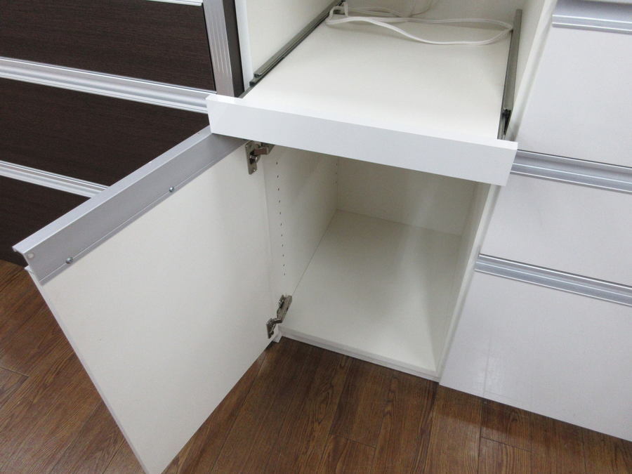 下部はスライドテーブル、引き出し×5、戸棚×3。