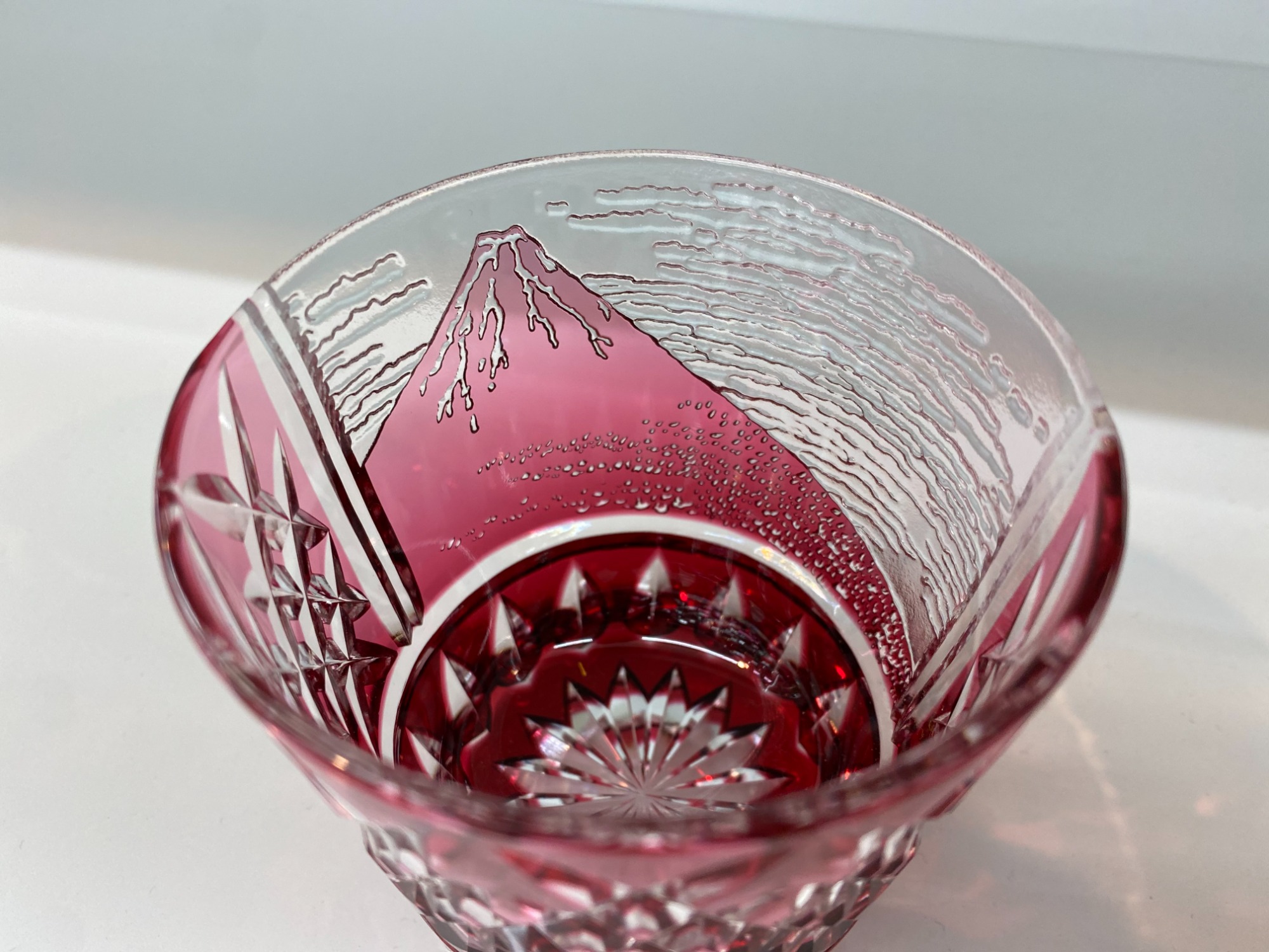 江戸切子といえば、厚さ1ミリ弱の色被せガラスに繊細な彫りを施し、その特徴であるシャープで鮮明な輝きを生み出すことができる点で一定の人気を誇っていることで有名ですよね。そんな江戸切子の「グラス」をご紹介いたします。こちらのグラスは伝統工芸士木村泰典作のものです。大きな富士山が一部に彫られており、雲や空をスモークガラスで表現するなど細部までこだわられたデザインとなっております。凱風快晴をモチーフとしたデザインで菊龍目を施した縁起の良いこだわりの逸品です。