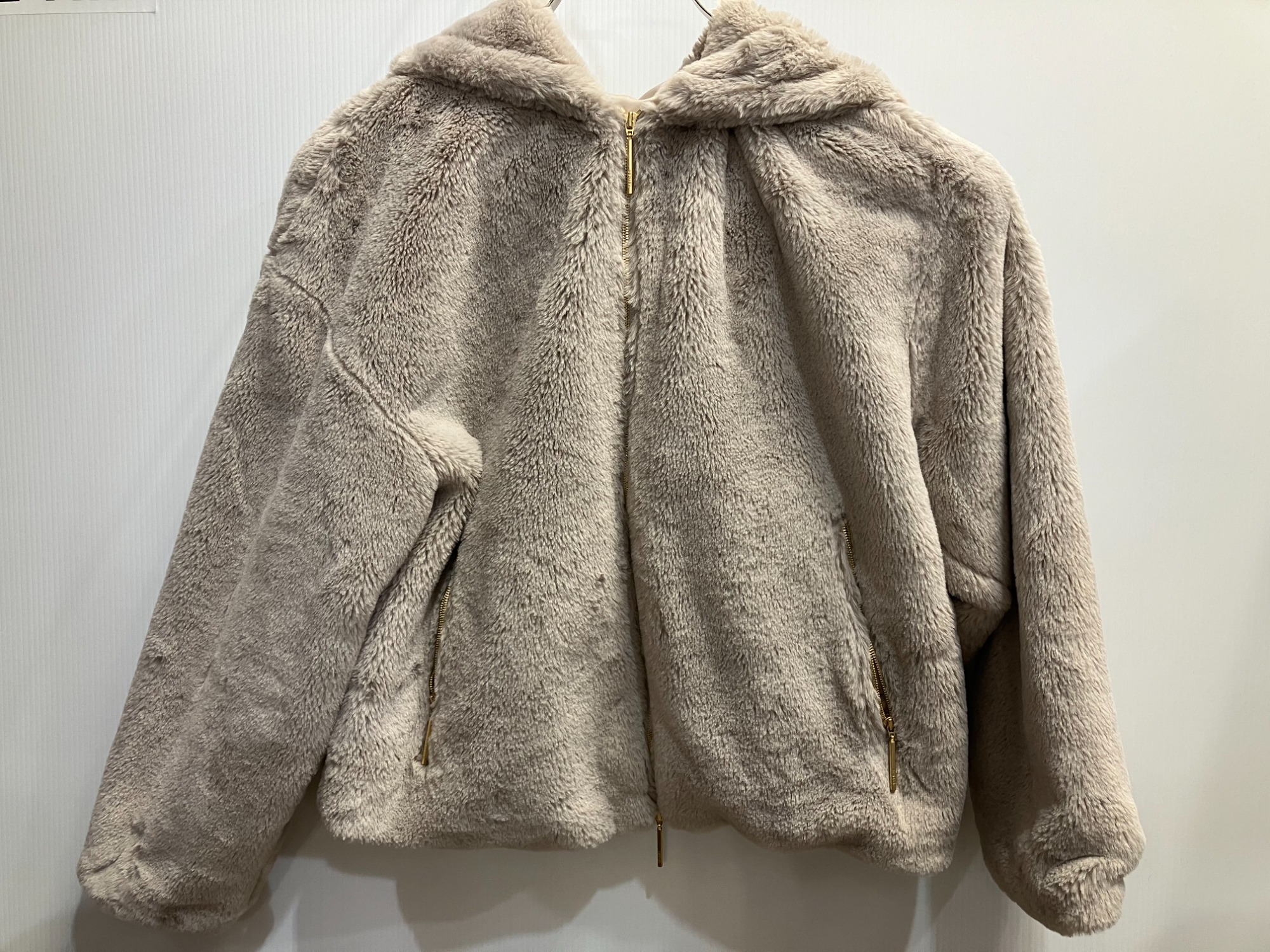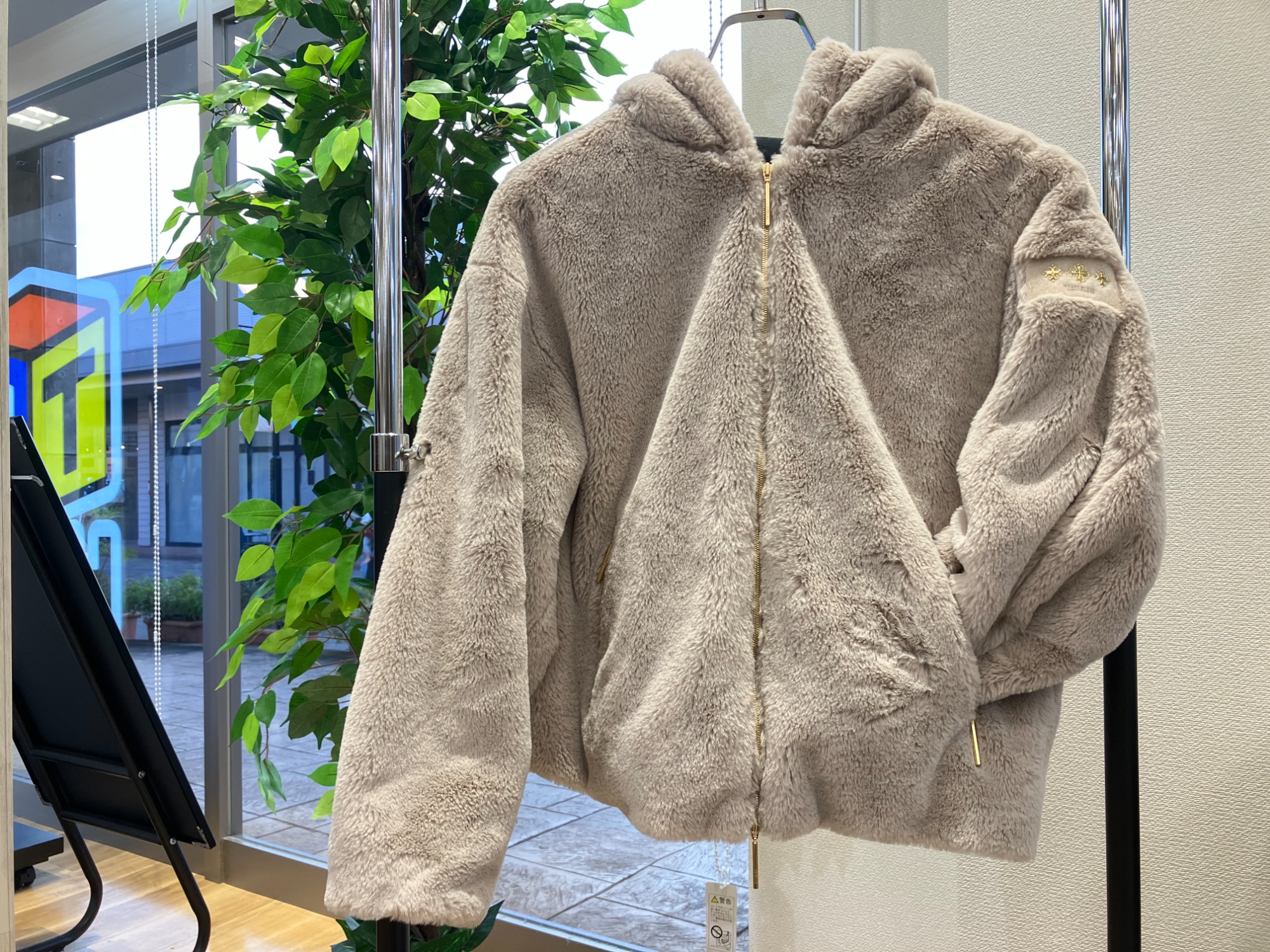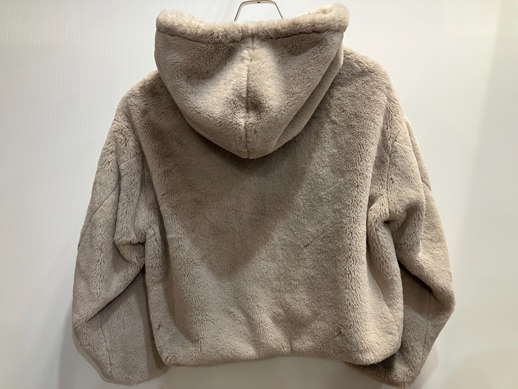 温かみのあるモコモコとしたボア素材を用いた、フード付きのジップアップジャケットです。