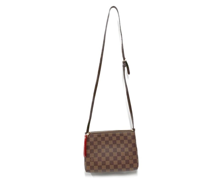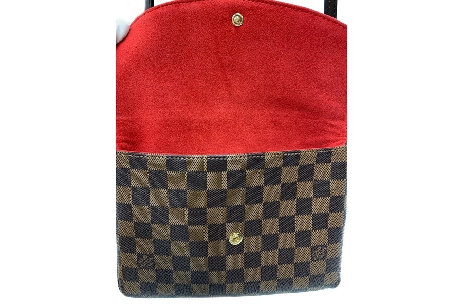 【スタッフコメント】非常に使いやすいサイズのショルダーポーチです。定番のダミエ柄に一部赤色が加わり(ストラップなど)お洋服にも埋もれないデザインです。