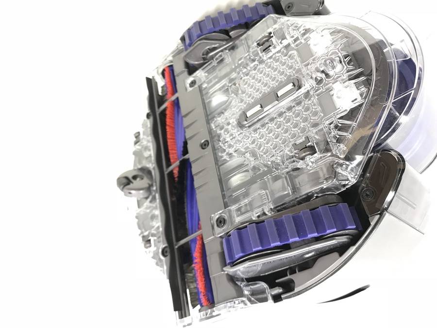 裏面もグリップの強そうなしっかりとしたラバーベルトにダイソンカラーともいえる象徴的なカラーリングの回転ブラシ。スケルトンのボディも他社とは一線を画すデザイン性となっております。