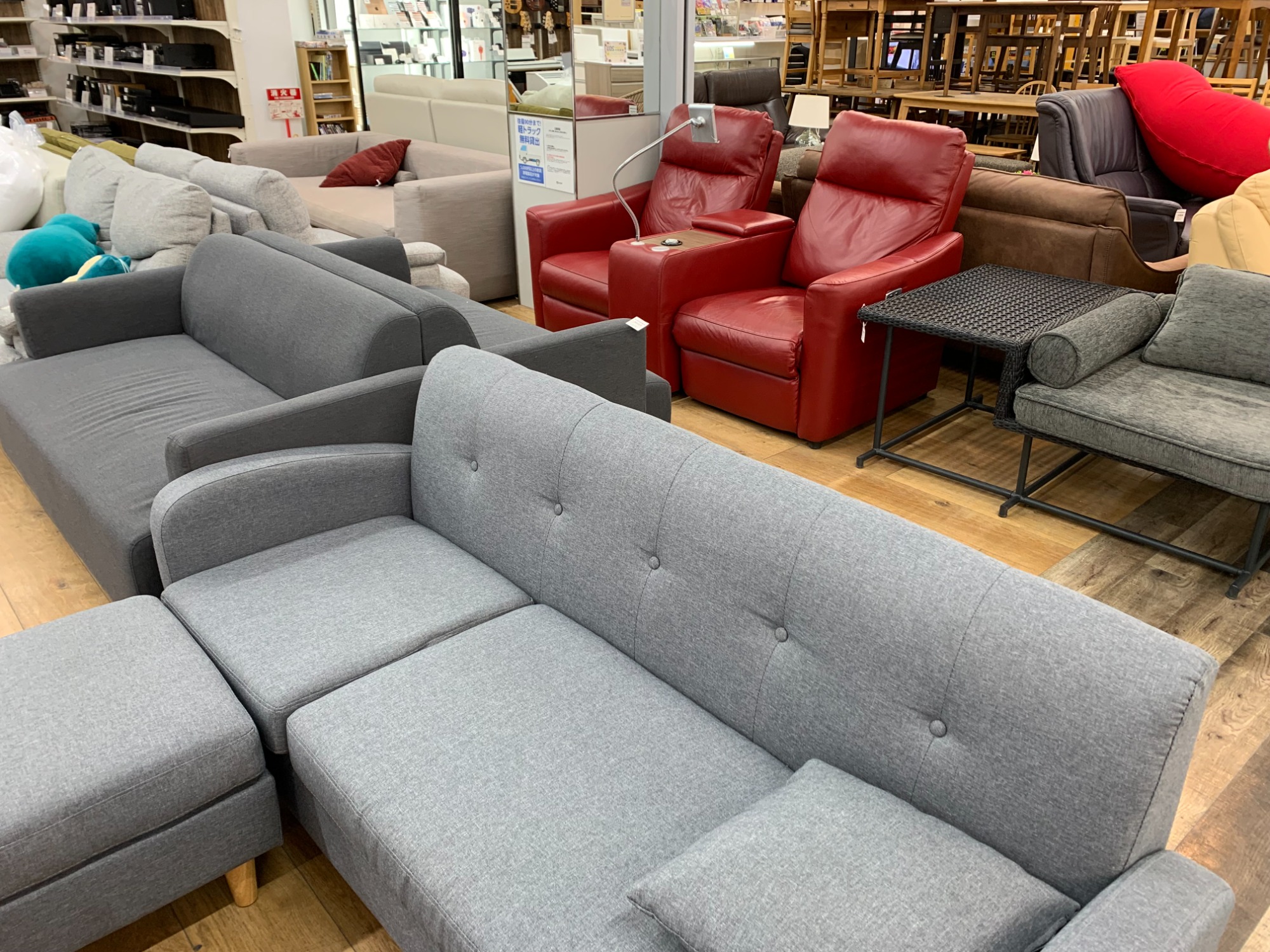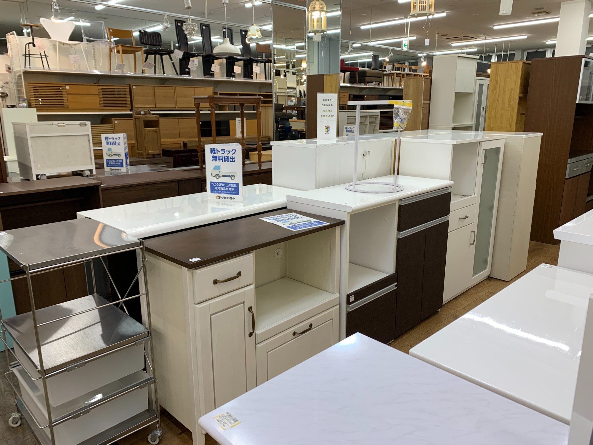 冷蔵庫・洗濯機・エアコンなど中古家電、食器棚やソファーなど中古家具は多数展示しています。