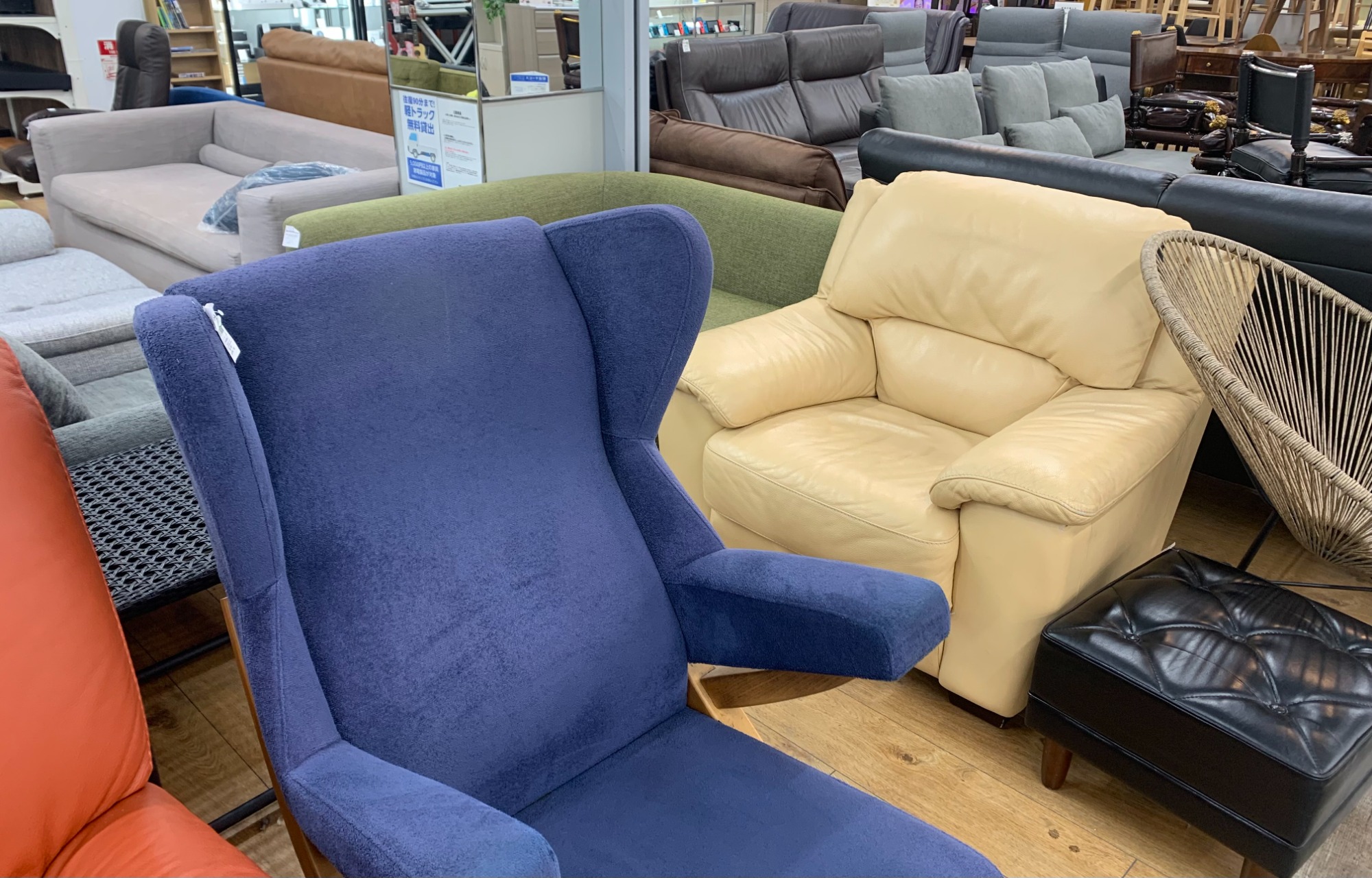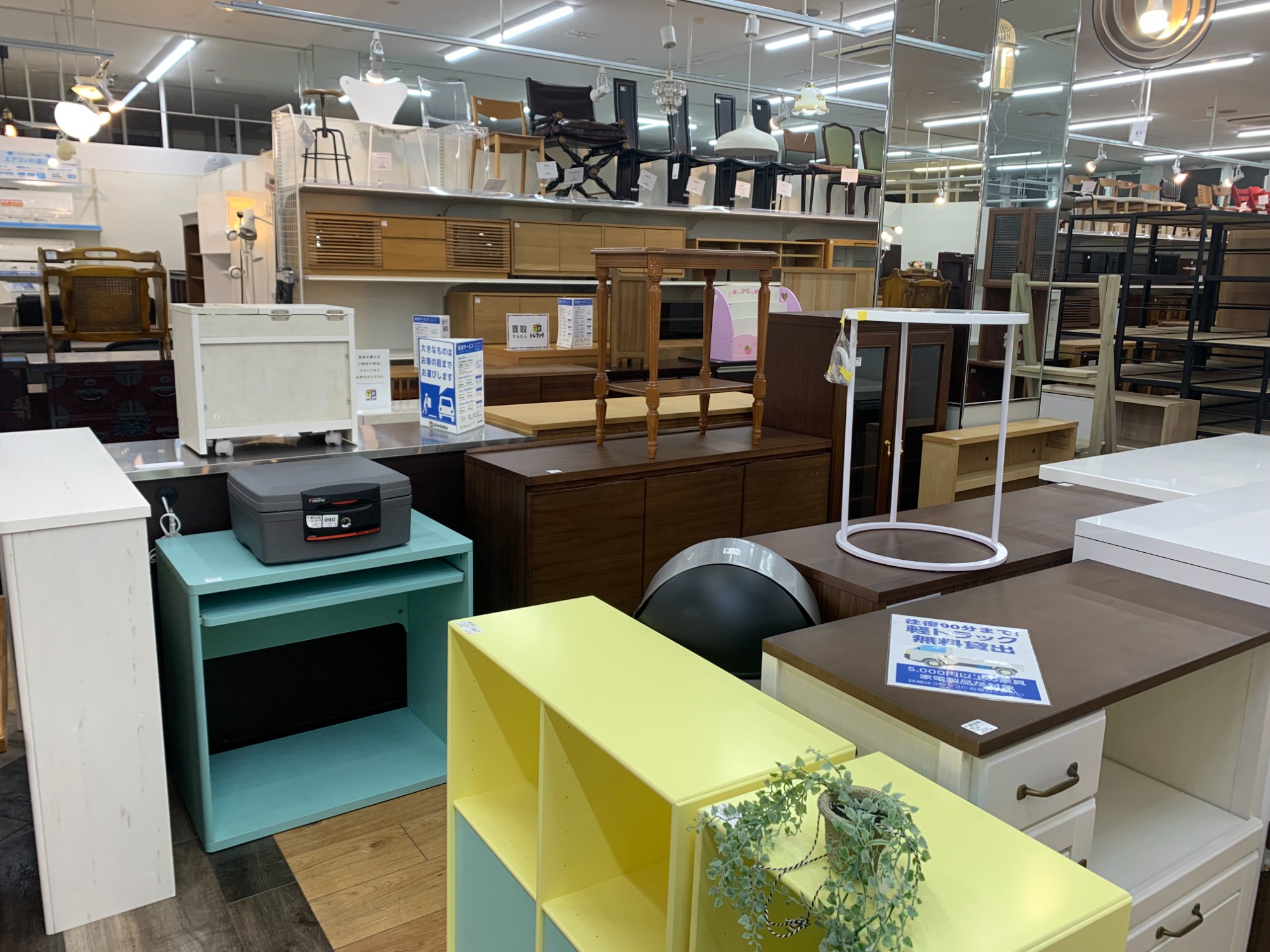 冷蔵庫・洗濯機・エアコンなど中古家電、食器棚やソファーなど中古家具は多数展示しています。