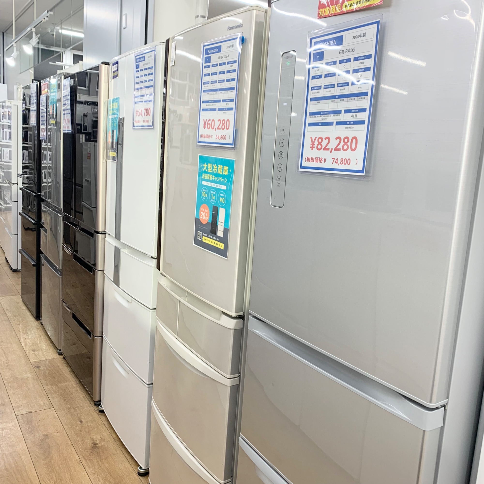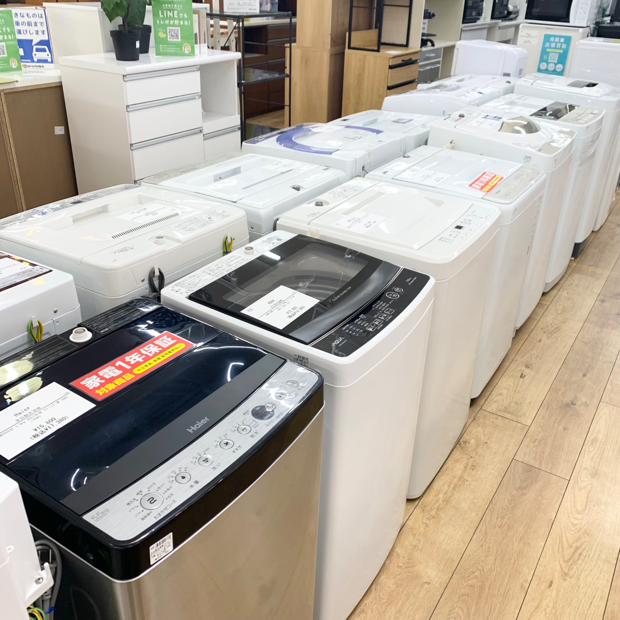 冷蔵庫・洗濯機・エアコンなど中古家電、食器棚やソファーなど中古家具は多数展示しております