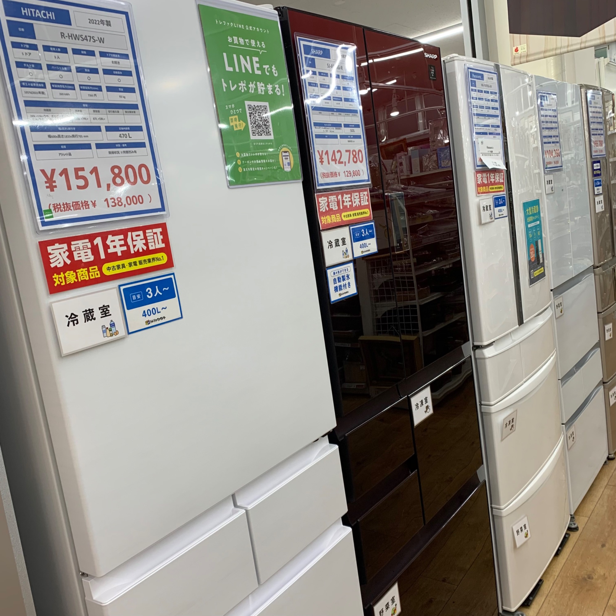 冷蔵庫・洗濯機・エアコンなど中古家電、食器棚やソファーなど中古家具は多数展示しております