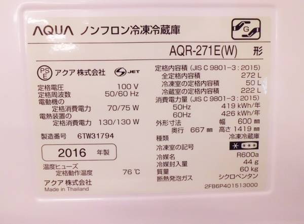 2016年製!AQUA AQR-271E 3ドア冷蔵庫が買取入荷しました!【大船店】