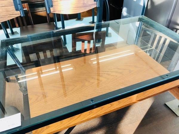ガラス天板とその下の木の板の