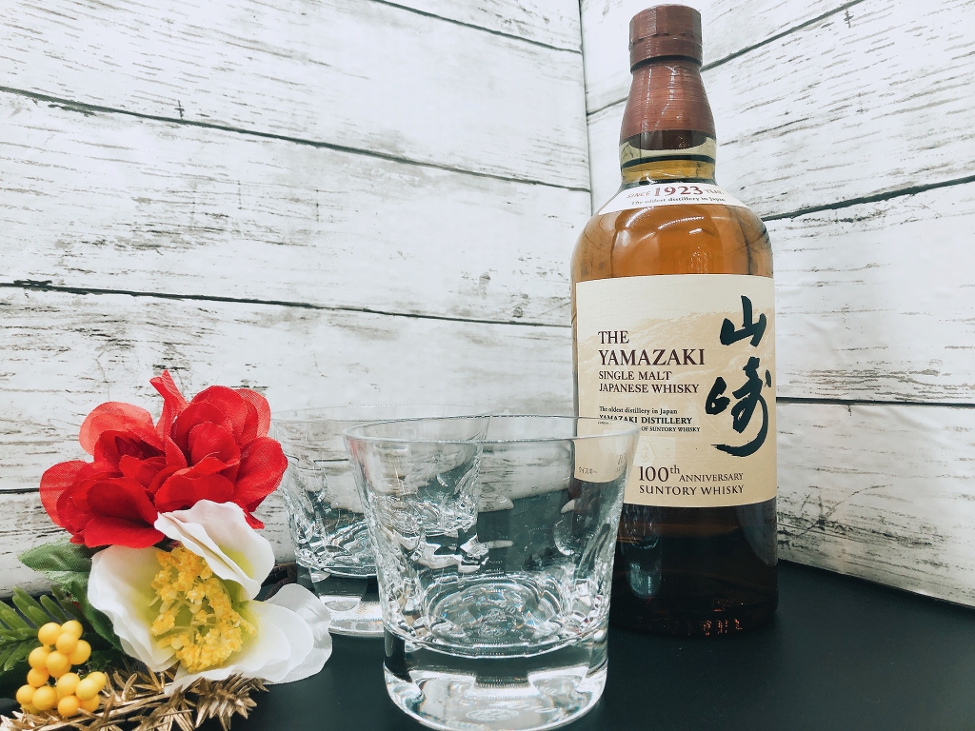 ジャパニーズウイスキーの山崎100周年記念ボトルとBaccarat (バカラ)ペアグラスになります♬