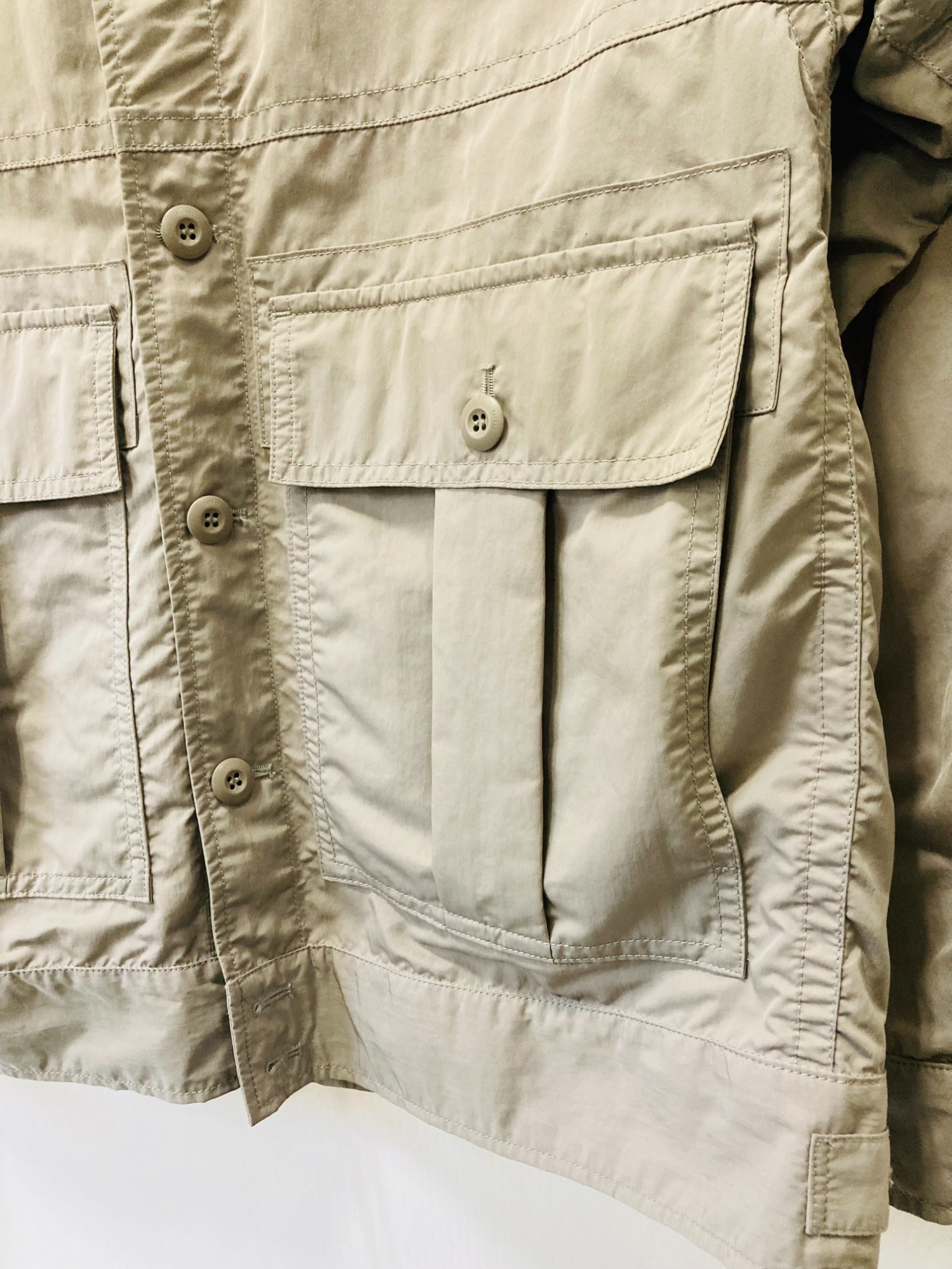 ご紹介いたしますジャケットはリラックスサイズのシャツジャケットになり、ハリ感を抑えたしなやかな風合いと光沢感が