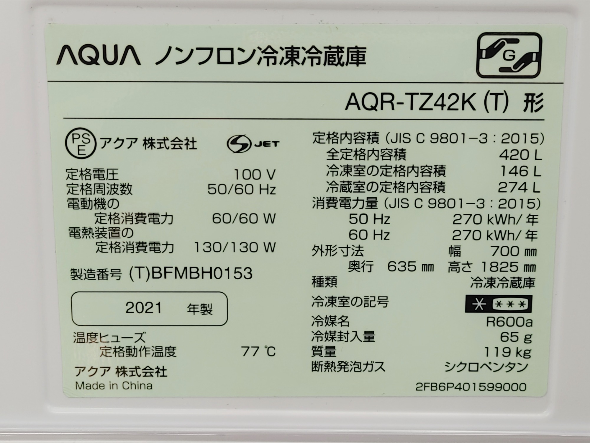 定格内容積 :420L