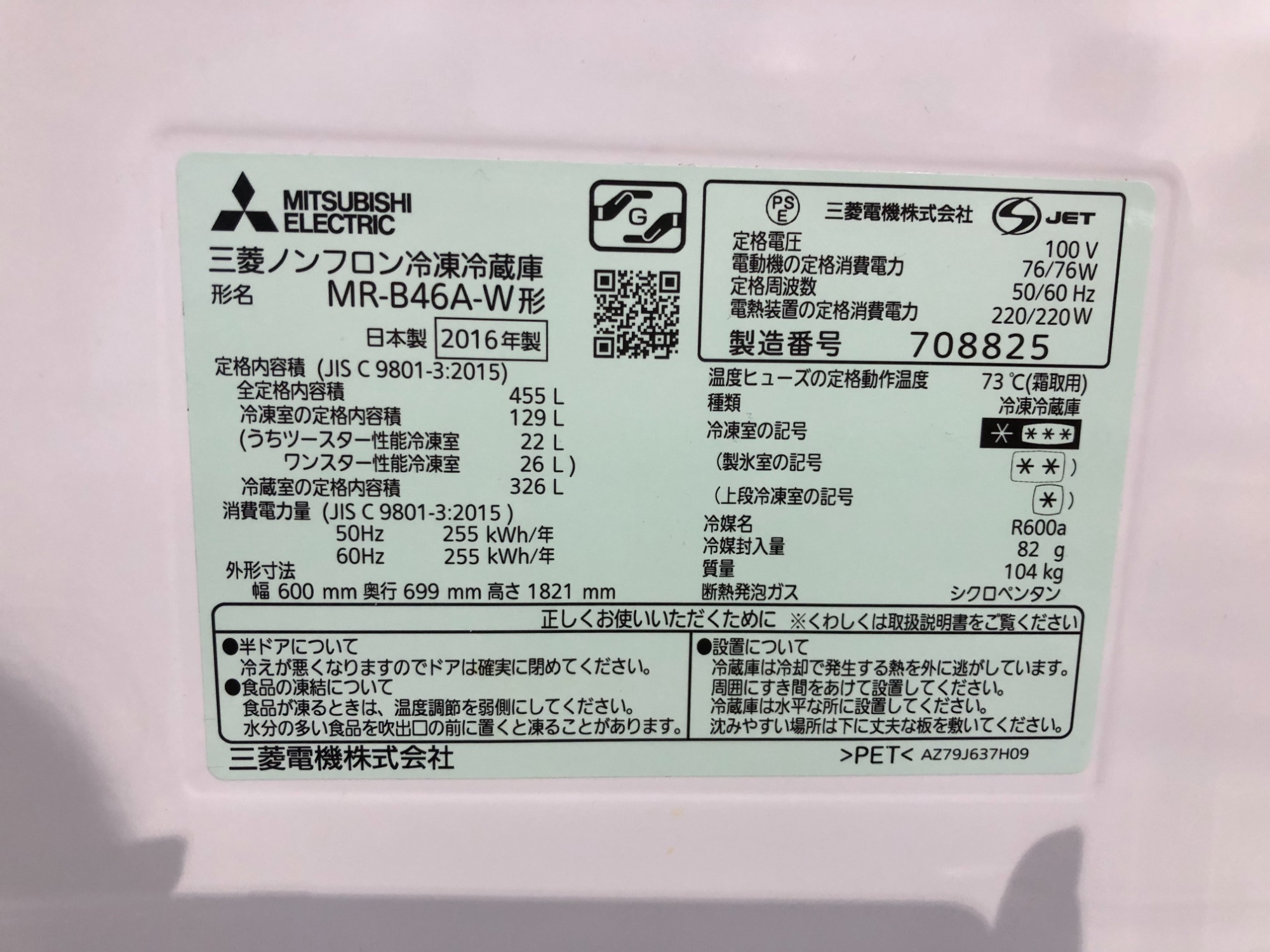 2016年製 5ドア冷蔵庫(MR-B46A)
