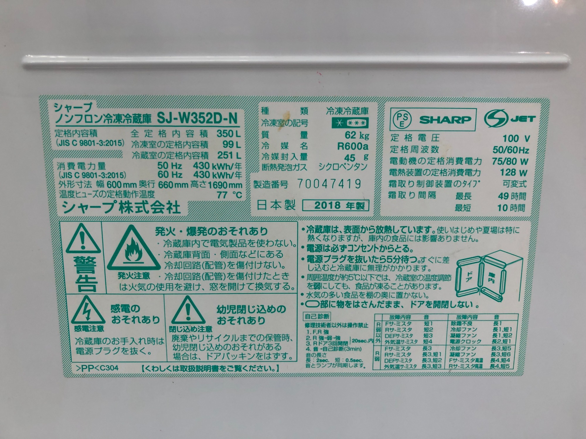 2018年製 3ドア冷蔵庫(SJ-W352D-N)