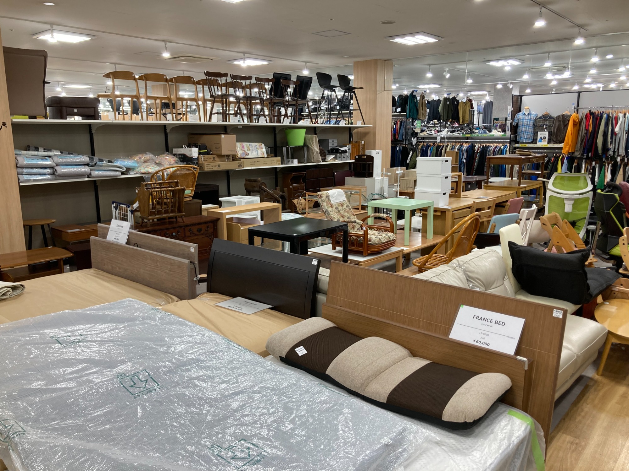 ・2階は衣類、3階は家具がそれぞれワンフロアで豊富に展示中。