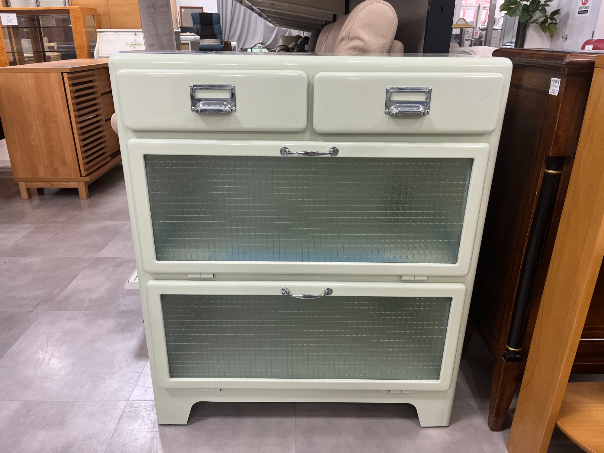 パステルカラーのこちらのお品物はどんなインテリアにも自然に馴染み、引き出しや扉の金属パーツがアクセントとなり、