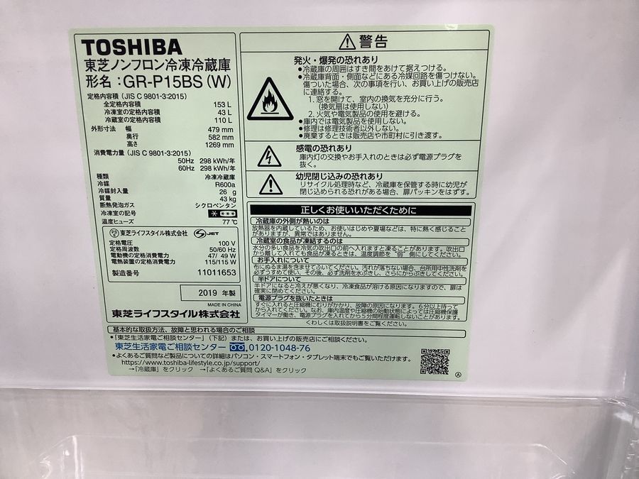 TOSHIBA(東芝)の2ドア冷蔵庫(GR-P15BS-W)をご紹介いたします!!
