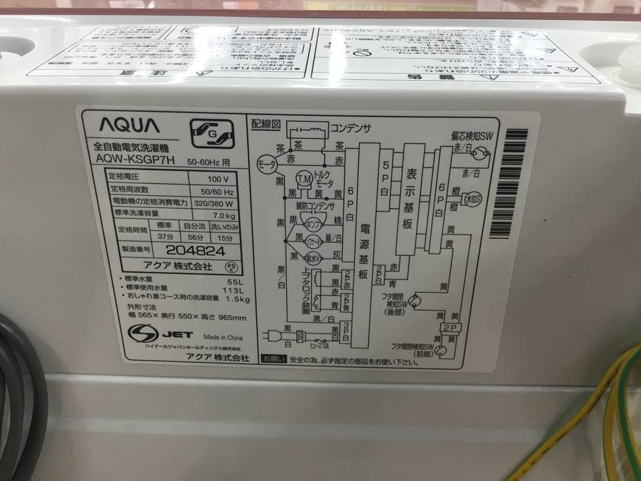 AQUA(アクア)の全自動洗濯機(AQW-KSGP7H)を買取入荷致しました!!