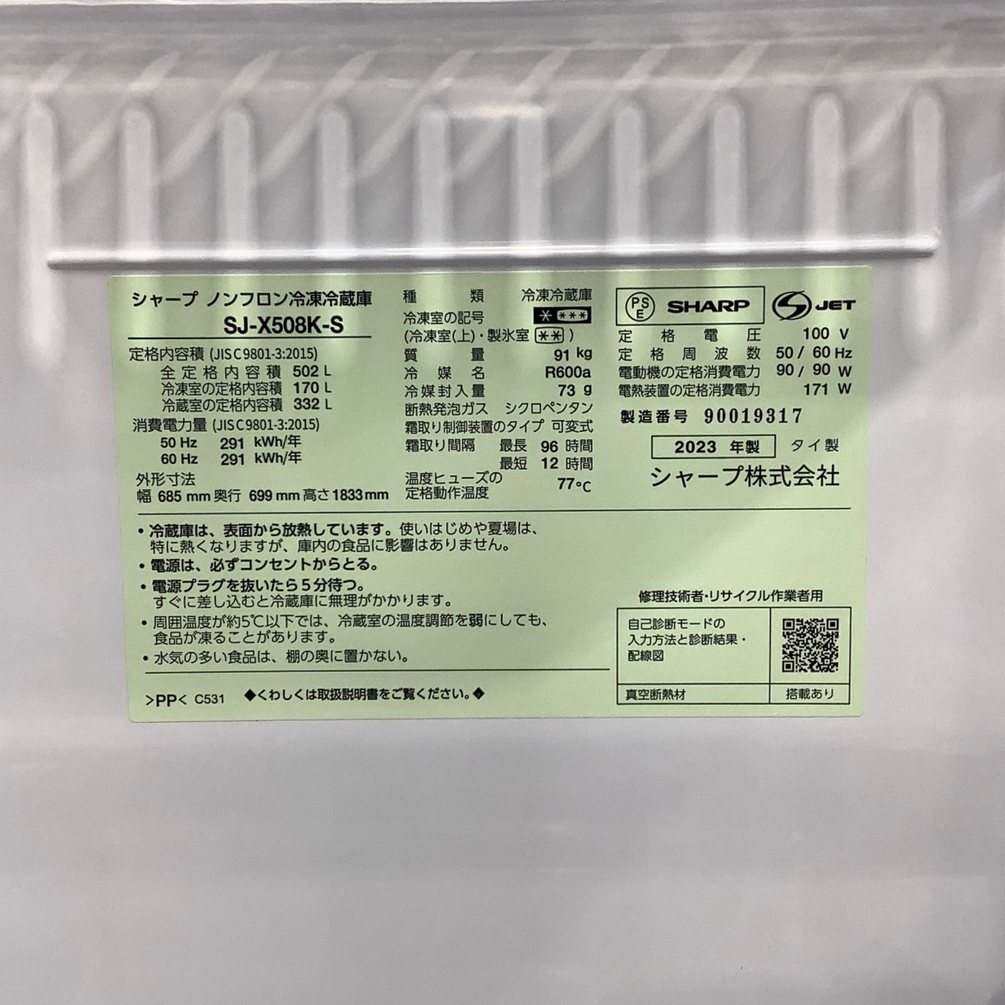 今回は、SHARP (シャープ) から 6ドア冷蔵庫 502L 23年製 SJ-X508K-S をご紹介します。