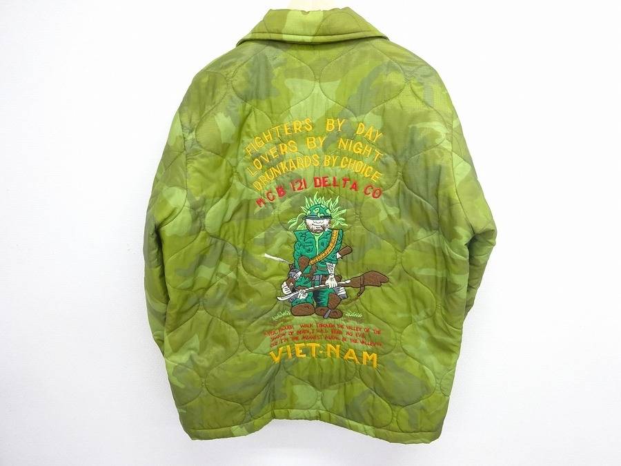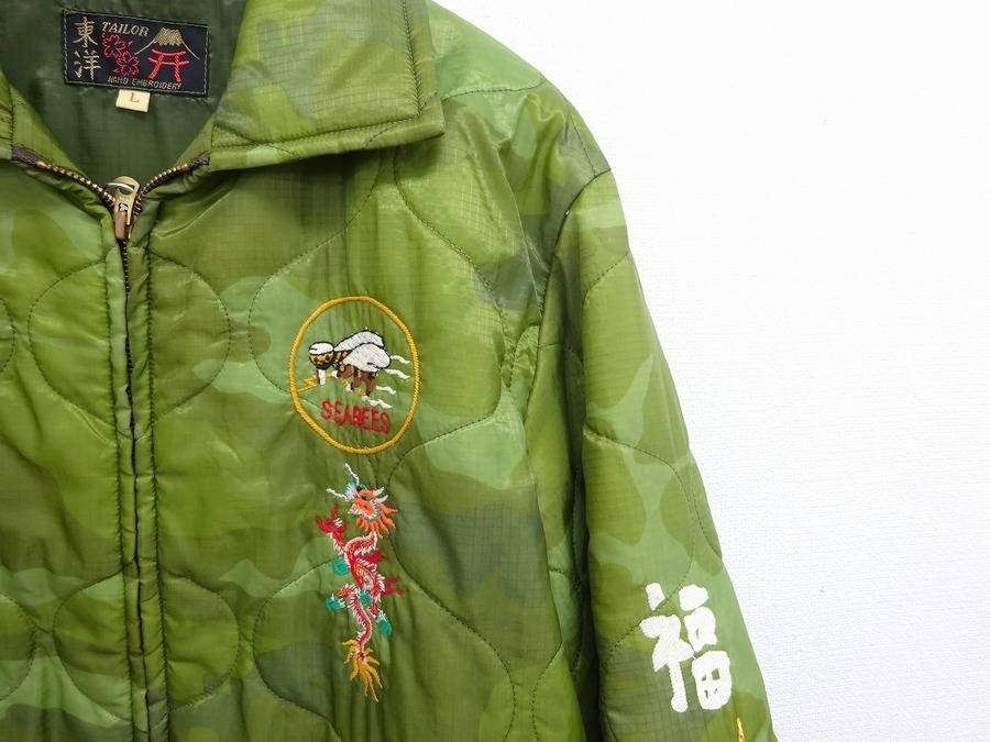 カモフラ柄のキルティングジャケットに刺繍が施されており、