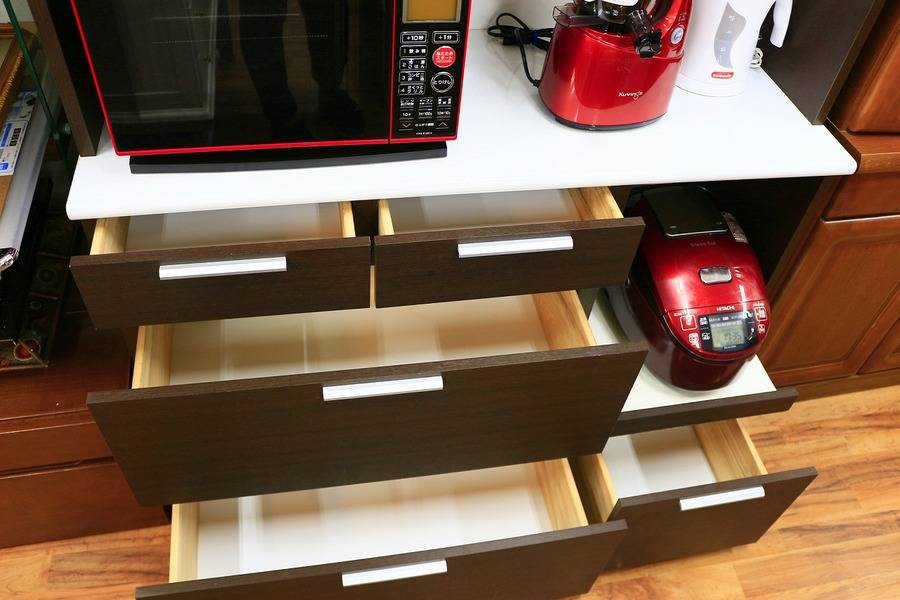 スライド式の棚があったり、大容量の引き出しが二個もついていたりと、収納性は抜群!