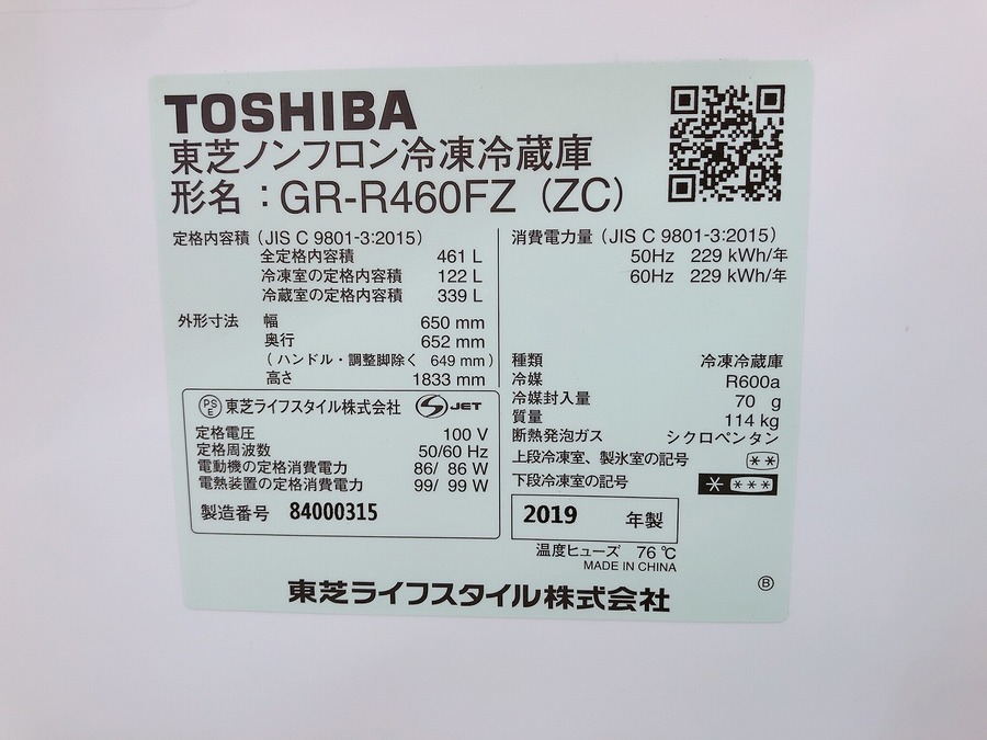 【TOSHIBA 東芝】冷蔵庫 GR-R460FZ 2019年製