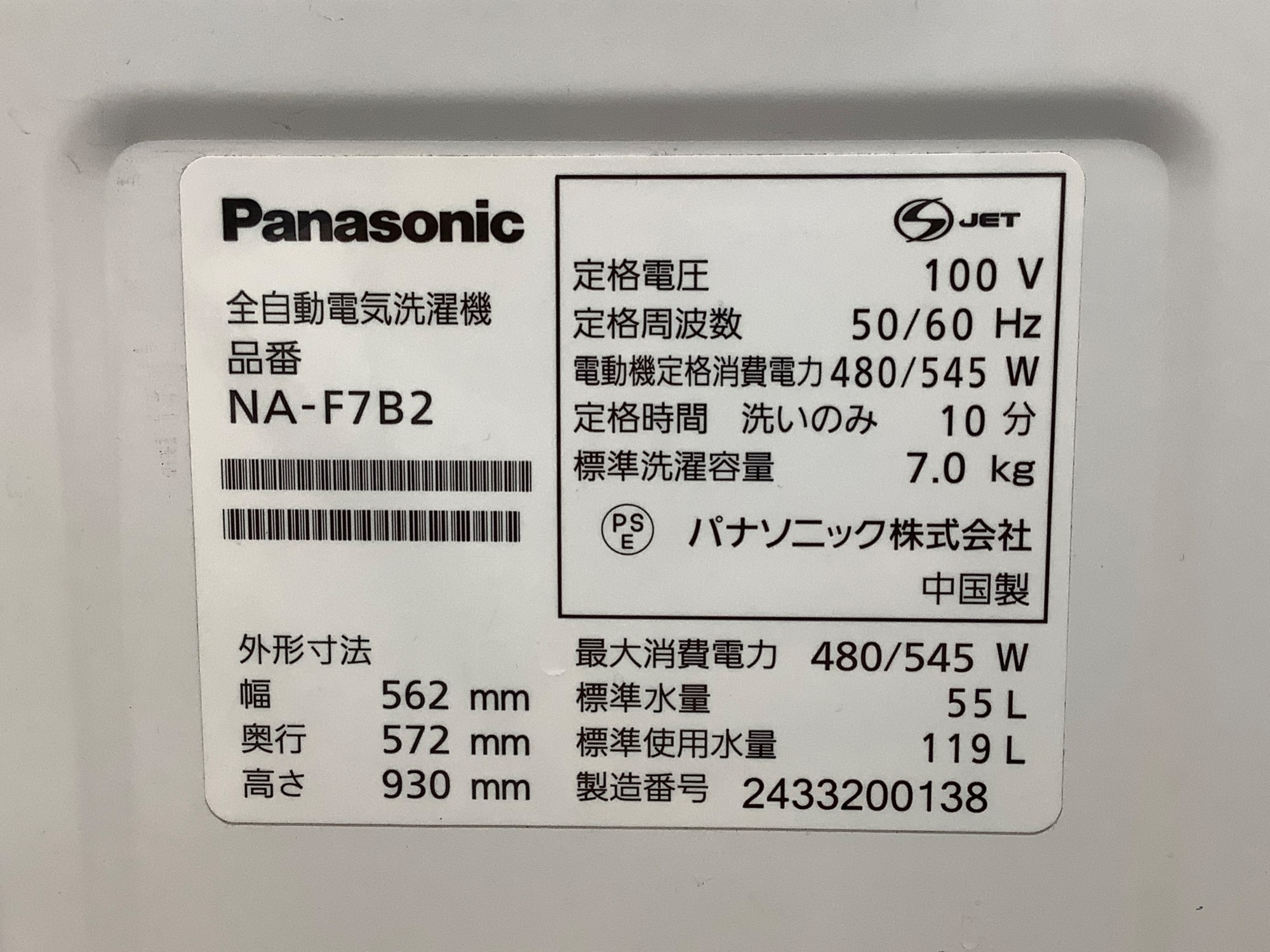 【新生活応援!】Panasonic 全自動洗濯機 NA-F7B2 7.0kg 2024年製 買取入荷いたしました!!