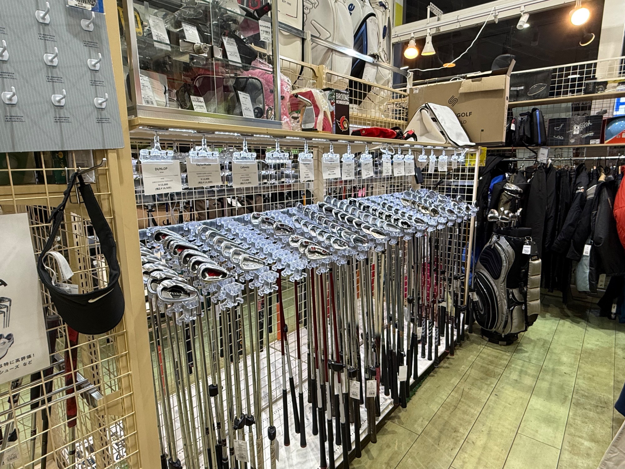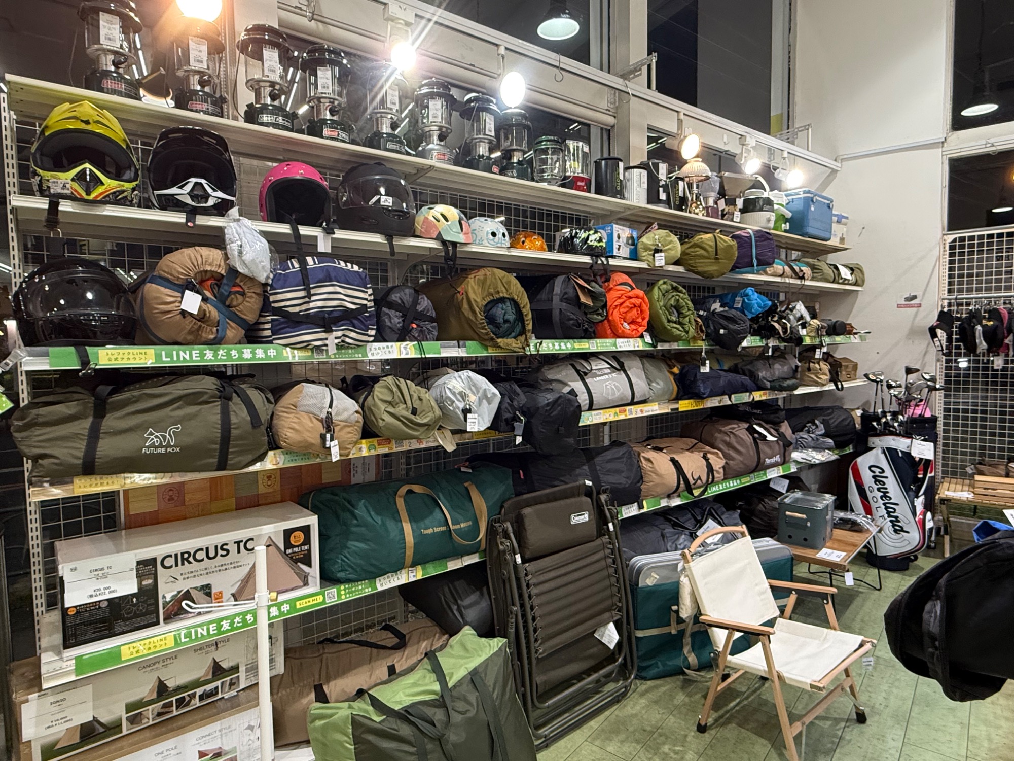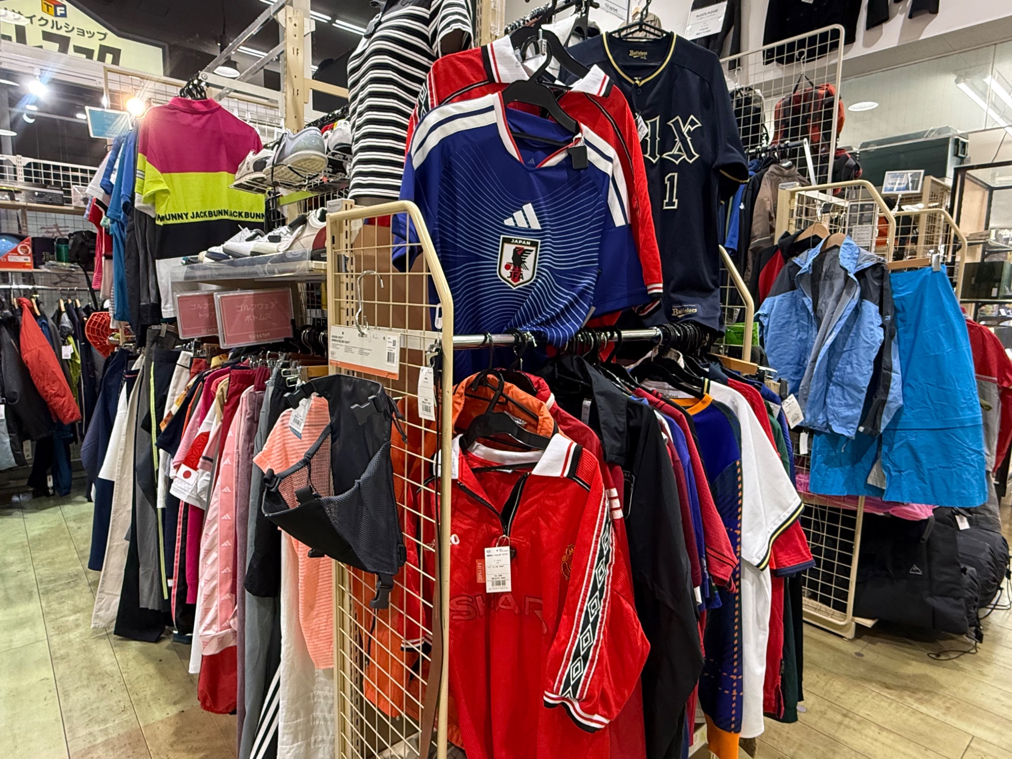 スポーツコーナーでは、トレーニング用のウェアやシューズ、ゴルフグッズ、ヘルメットなど多くのお品物がございます!