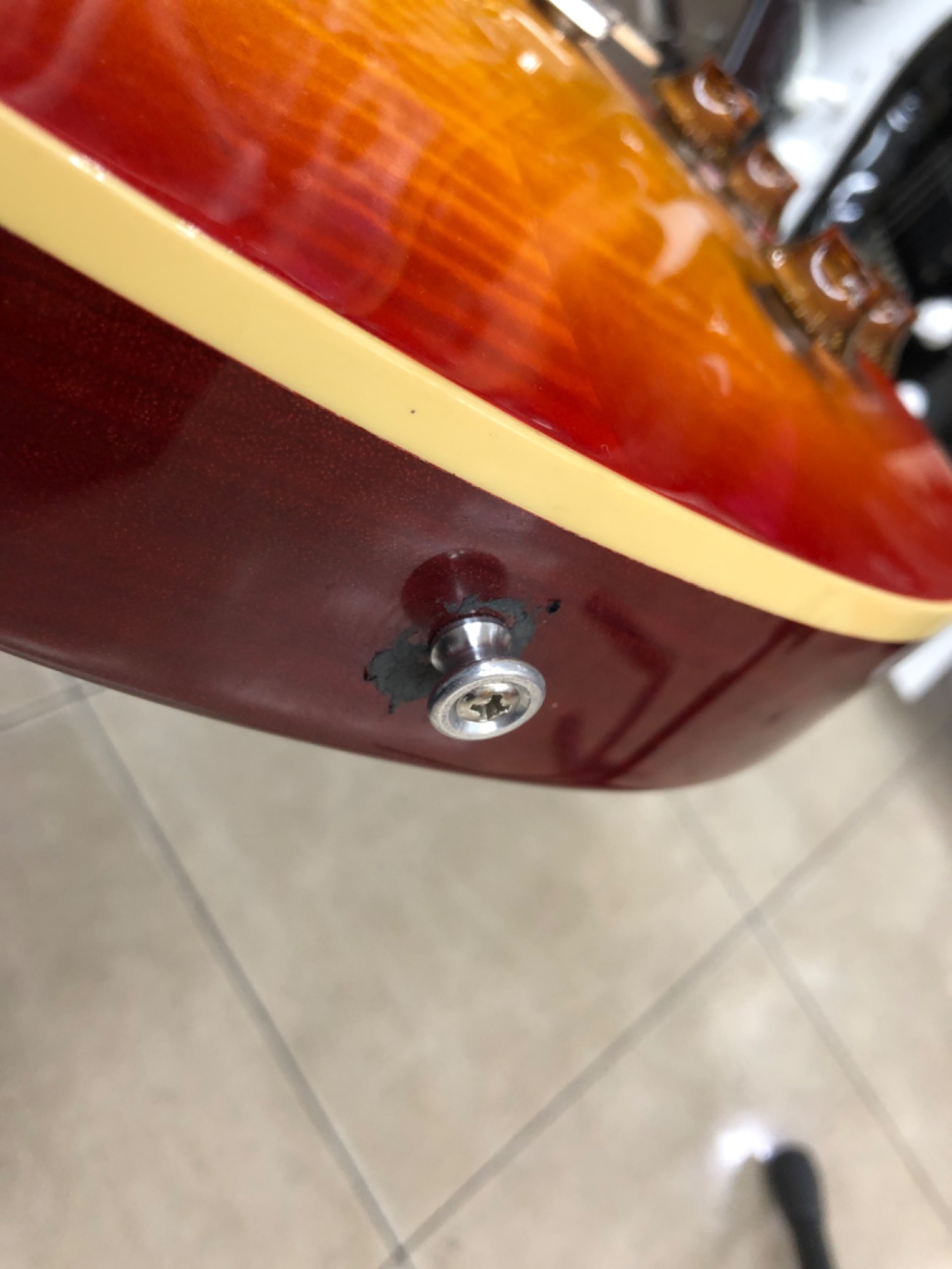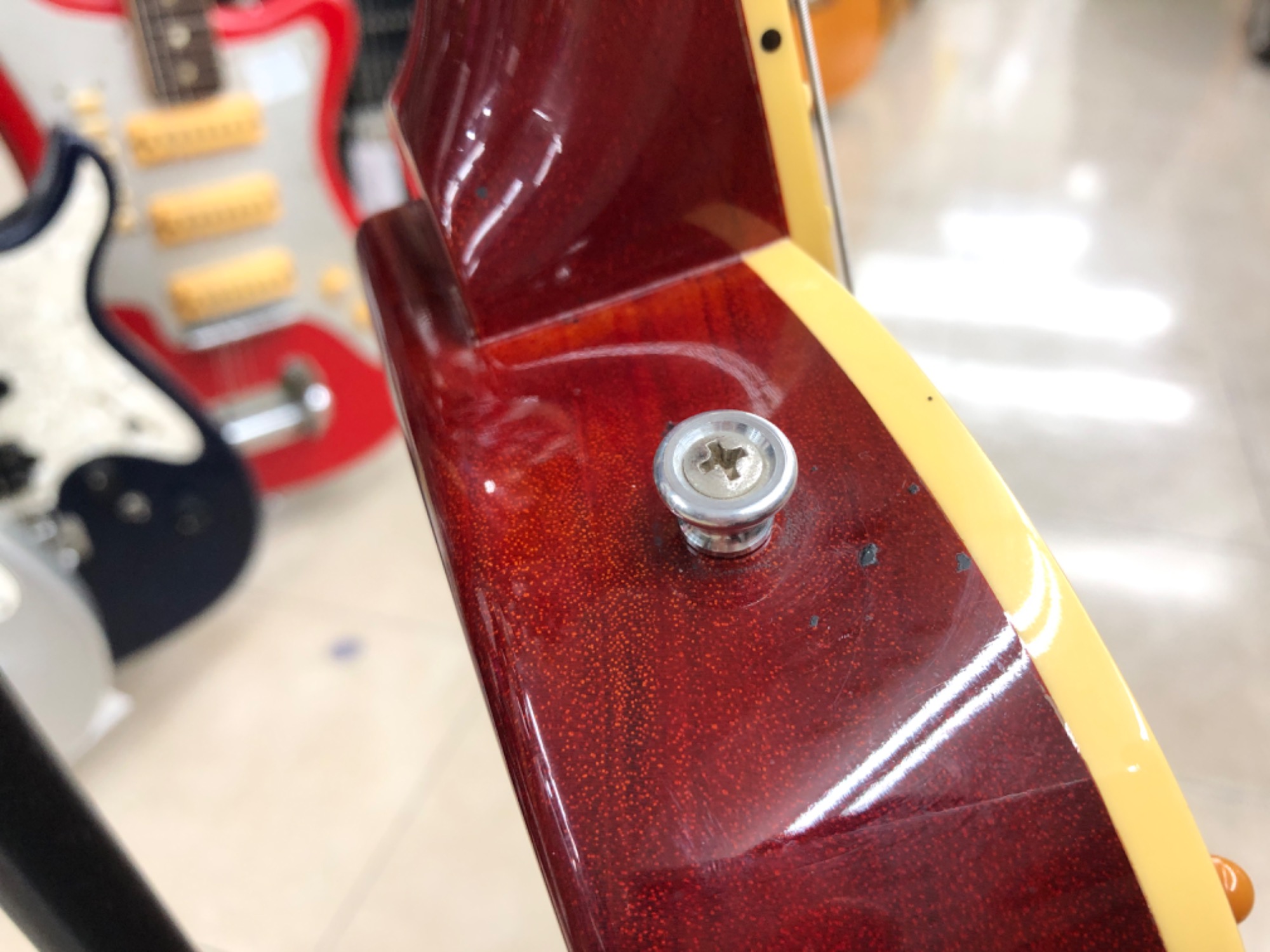 ネック側、ボディエンド側のストラップピン付近に劣化したストラップが固着しています。