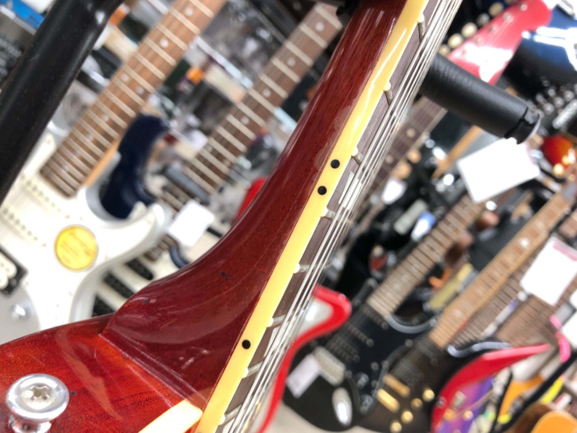 木部までは達していませんが、ネックのバインディングに沿って塗装クラックがございます。